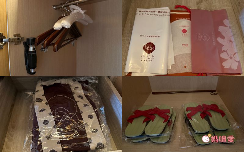 衣櫃裡面提供了多個衣架,外套或暫時還不需要洗的外出服可以掛得整整齊齊。抽屜內貼心提供了汙衣袋、大人及小孩的浴袍、榻榻米質感的夾腳拖,讓房客可以用最輕鬆的姿態去泡溫泉。