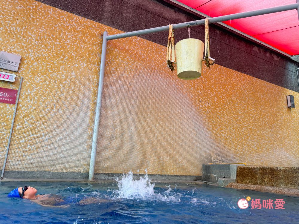 兒童戲水區的高度較淺,大概五十公分左右,連4歲的晳站在上面都沒問題,互動裝置有裝滿水會往下傾洩的水桶,以及會不斷灑水的小蘑菇