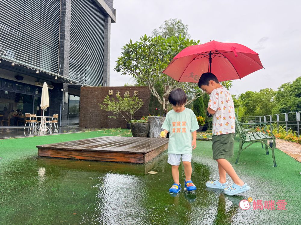 日光溫泉會館的設施主要在室內,但餐廳外的戶外區也非常漂亮,可以從外看到堆疊的山巒及繚繞的雲朵,雖然外面下著濛濛細雨,但霂、晳依然在外撿被雨打落的花朵,並踩著水漥,不論什麼天氣,只要能玩都很開心呢!