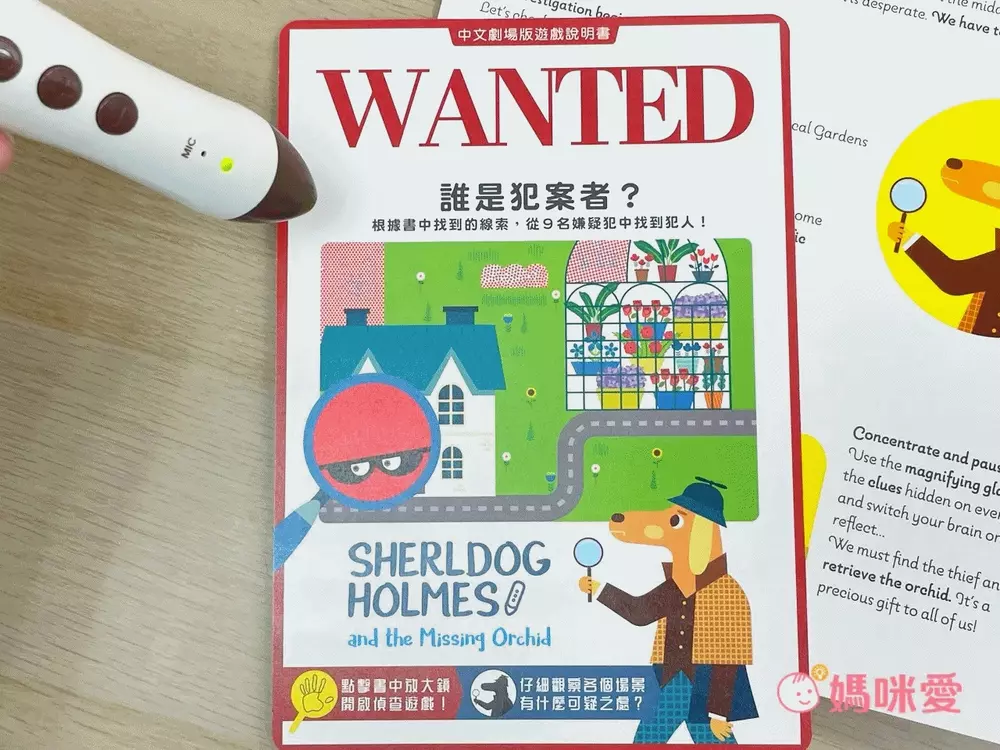 書中的文字是全英文,如想聽中文偵查遊戲:點擊左下放大鏡排除犯人;點擊右下偵探狗找到書中線索。