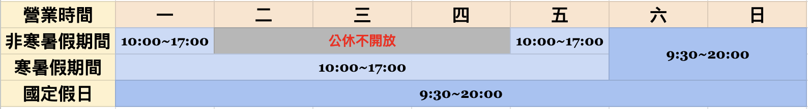 營業時間:平日週一及週五 10:00~17:00(非寒暑假之週二/三/四公休不開放),例假日及國定假日9:30~20:00;寒暑假期間週一至週五10:00~17:00,其他公休日將另行公告。(官方臉書)