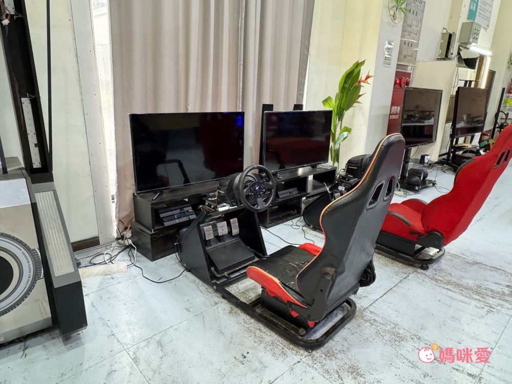 用餐休憩區備有桌椅及按摩椅,可以簡單用餐或是放鬆一下;一樓還有閃動格子體感遊戲區及KTV包廂(可容納10-12人)可以預約,都不用另外付費!
