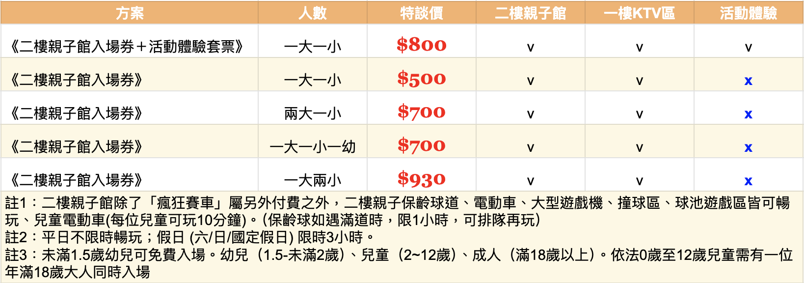套票方案:可使用於二樓親子保齡球館,全館可暢玩 (包含二樓親子保齡球道、大型遊戲機、撞球區、球池遊戲區、電動車、兒童電動車(每位兒童10分鐘)、一樓KTV;惟「瘋狂賽車」需另外收費)。