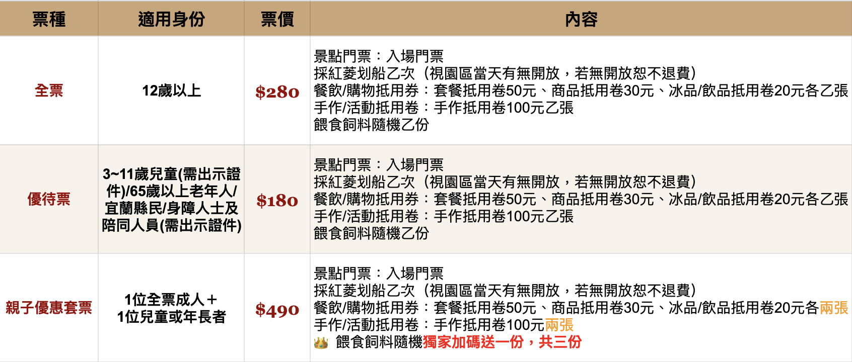優待票 $180,3~11歲兒童(需出示證件)/65歲以上老年人/宜蘭縣民/身障人士及陪同人員(需出示證件)