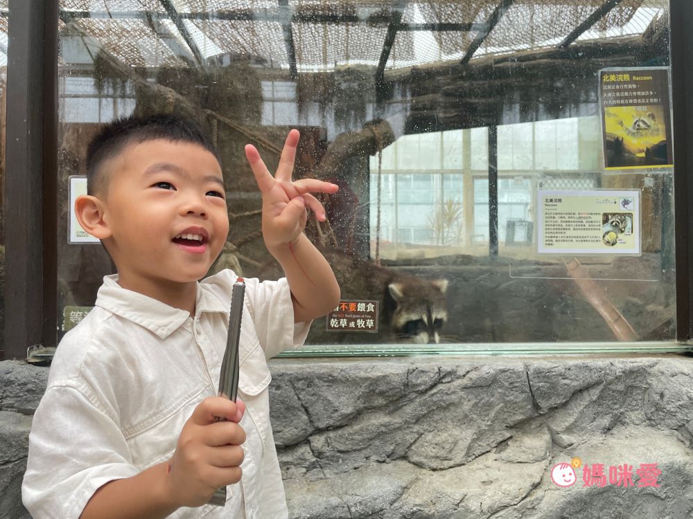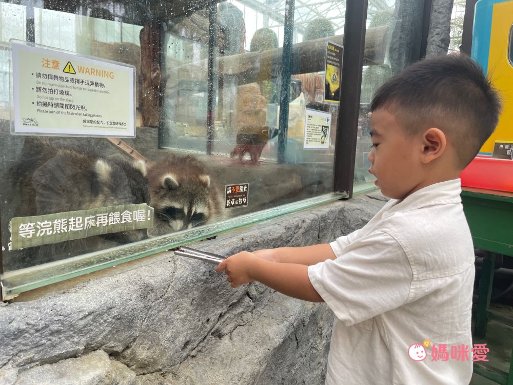 這邊浣熊還可以餵食,用夾子把飼料放在玻璃下緣縫隙中,浣熊就會用手撥進去吃掉,一旁也有飼養員在旁協助,小孩或長輩在餵食都很安全。