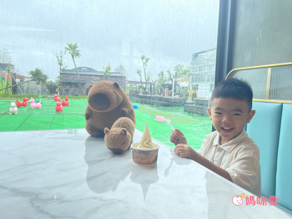 「戶外公園草坪」就在餐廳櫥窗旁邊,有多隻跳跳馬可供小孩玩,家長坐在餐廳就可以看見小孩。大致分為幾大區域「羊駝散散步」「袋鼠農場」「水豚森林浴」「羊咩咩村」戶外動物區也都可以餵食和動物們互動喔!