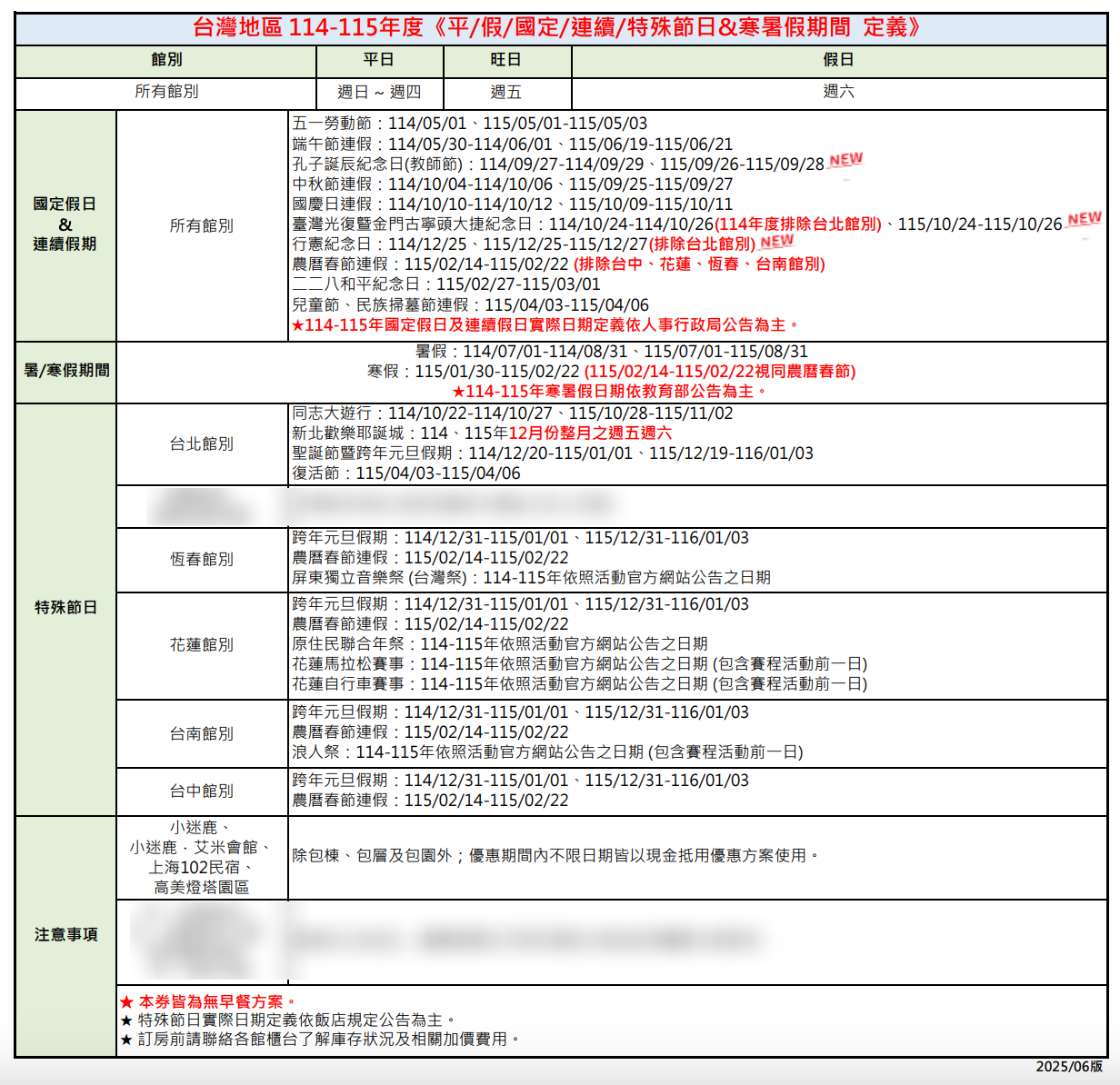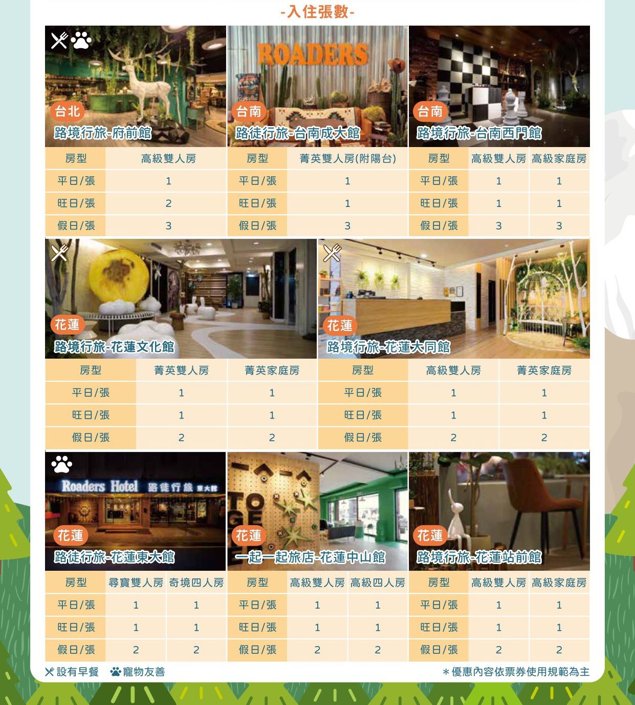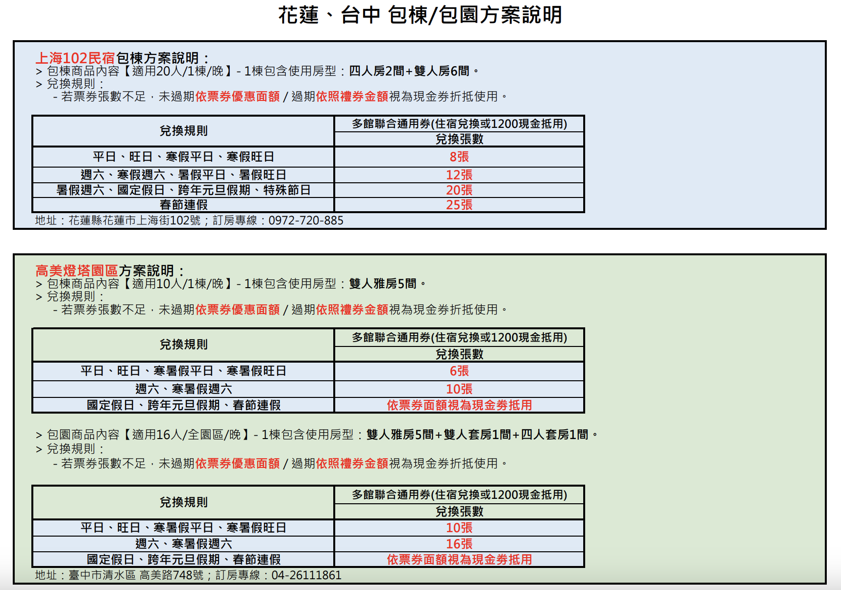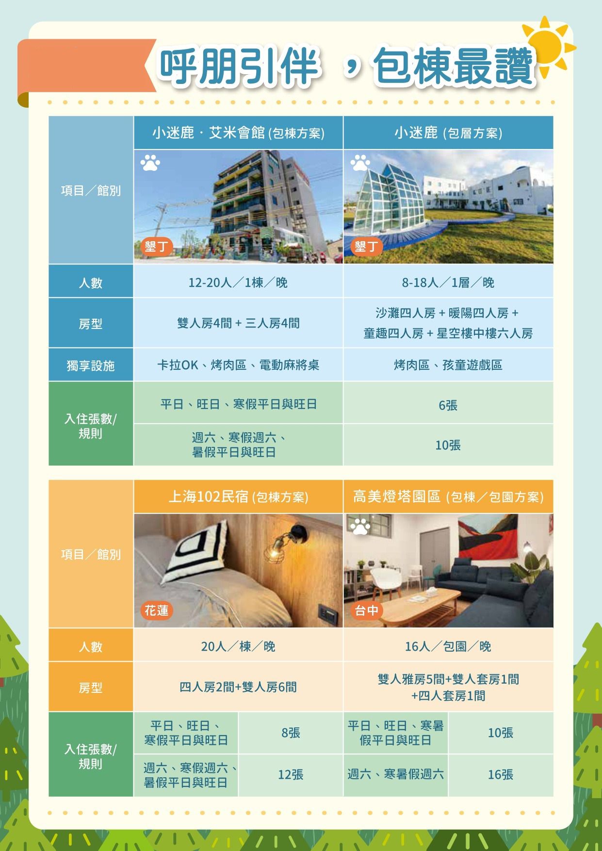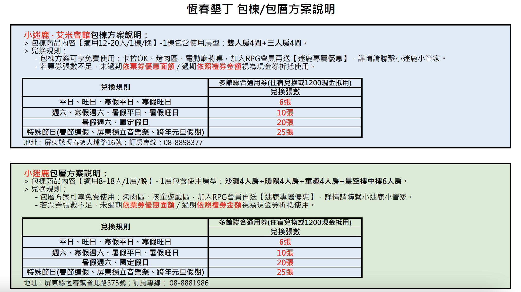 註:各分館有人數上限,使用相應票券數量,至多就可入住到相應的人數(例如:小迷鹿包層方案,一般與寒假平旺日可使用六張券入住,至多可入住到18人)