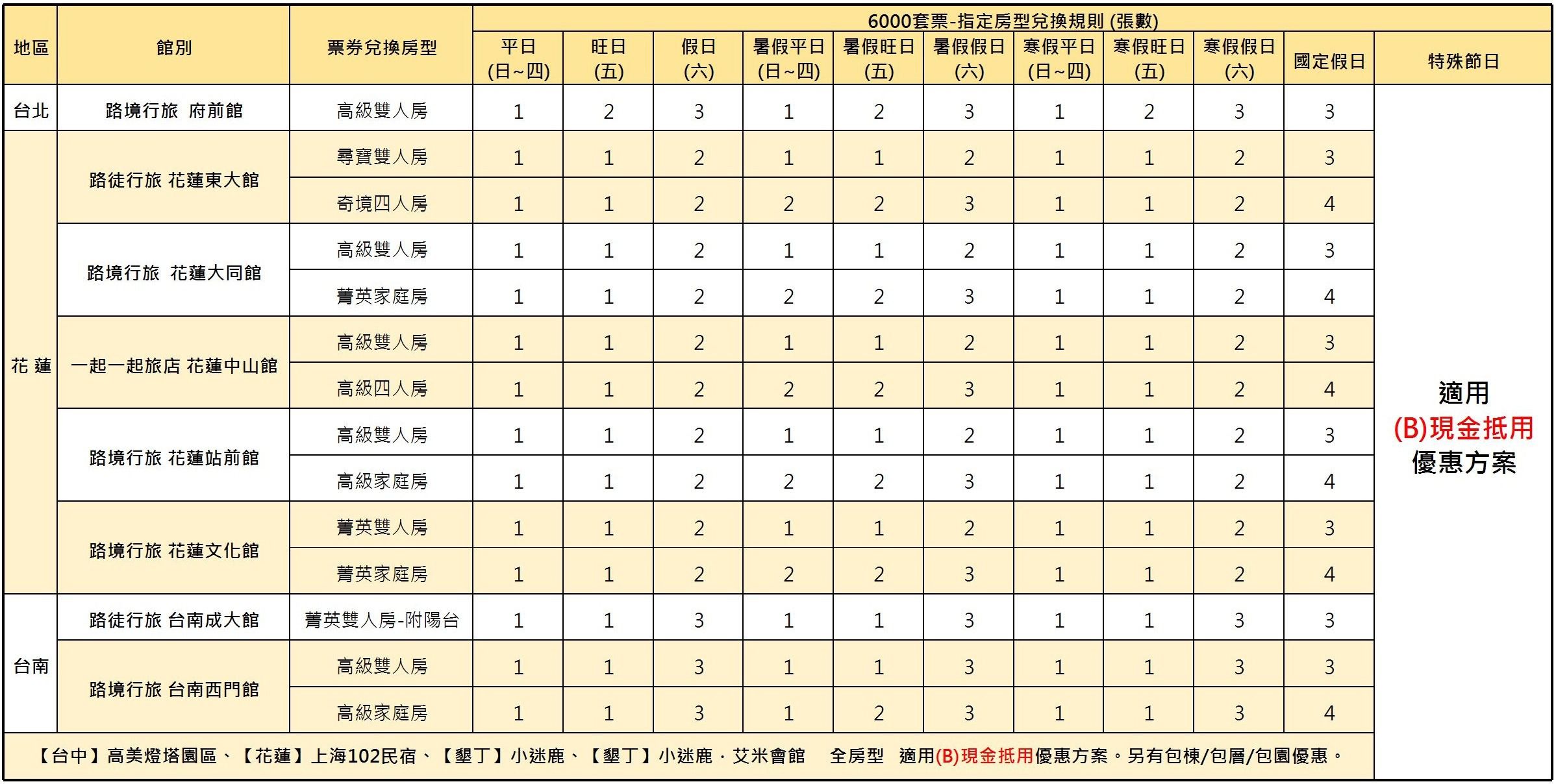 (B)現金抵用:住宿消費、休息消費、提早入住和延遲退房抵用,一張券可折抵上述費用$1200(不限張數使用)。
