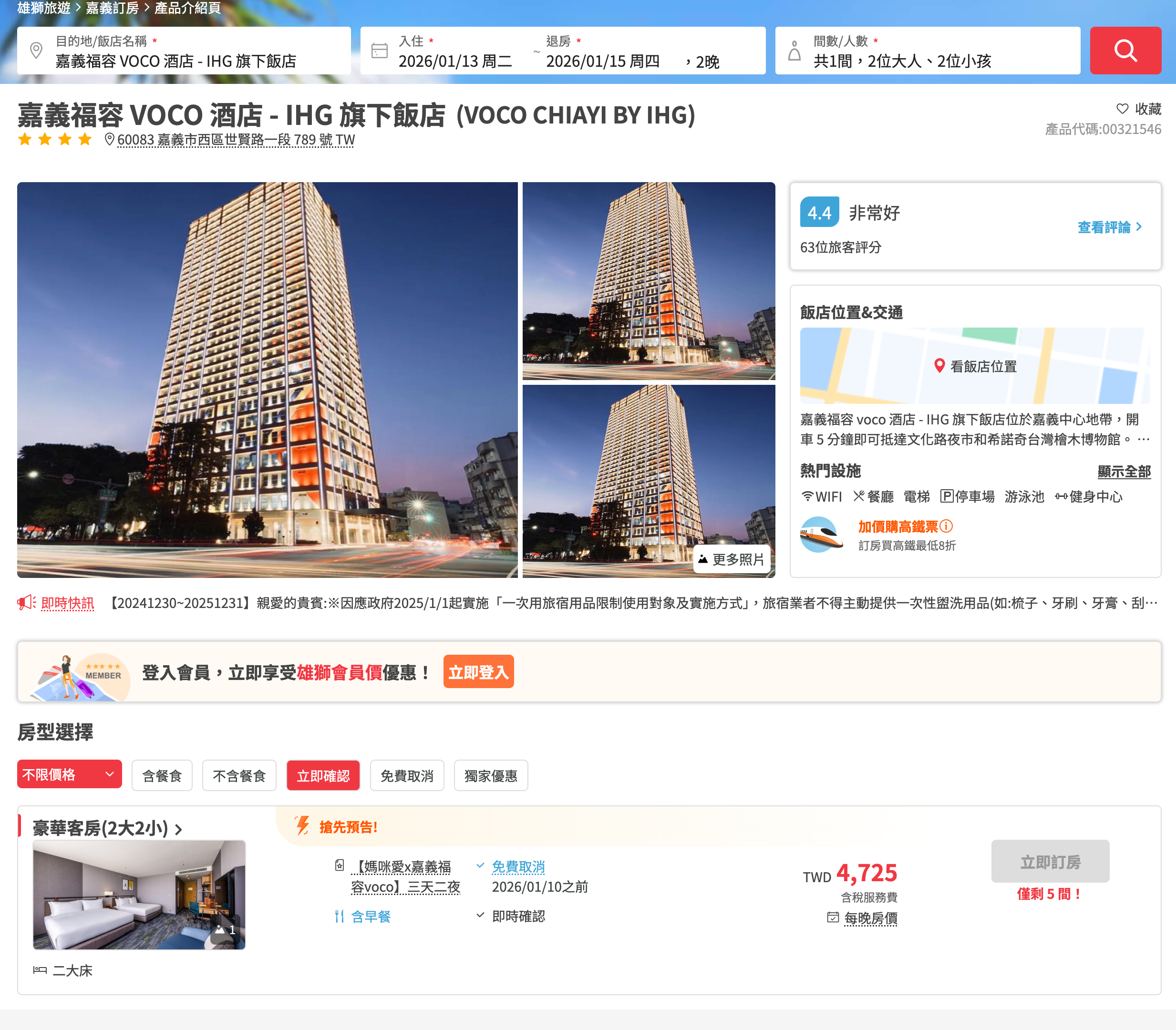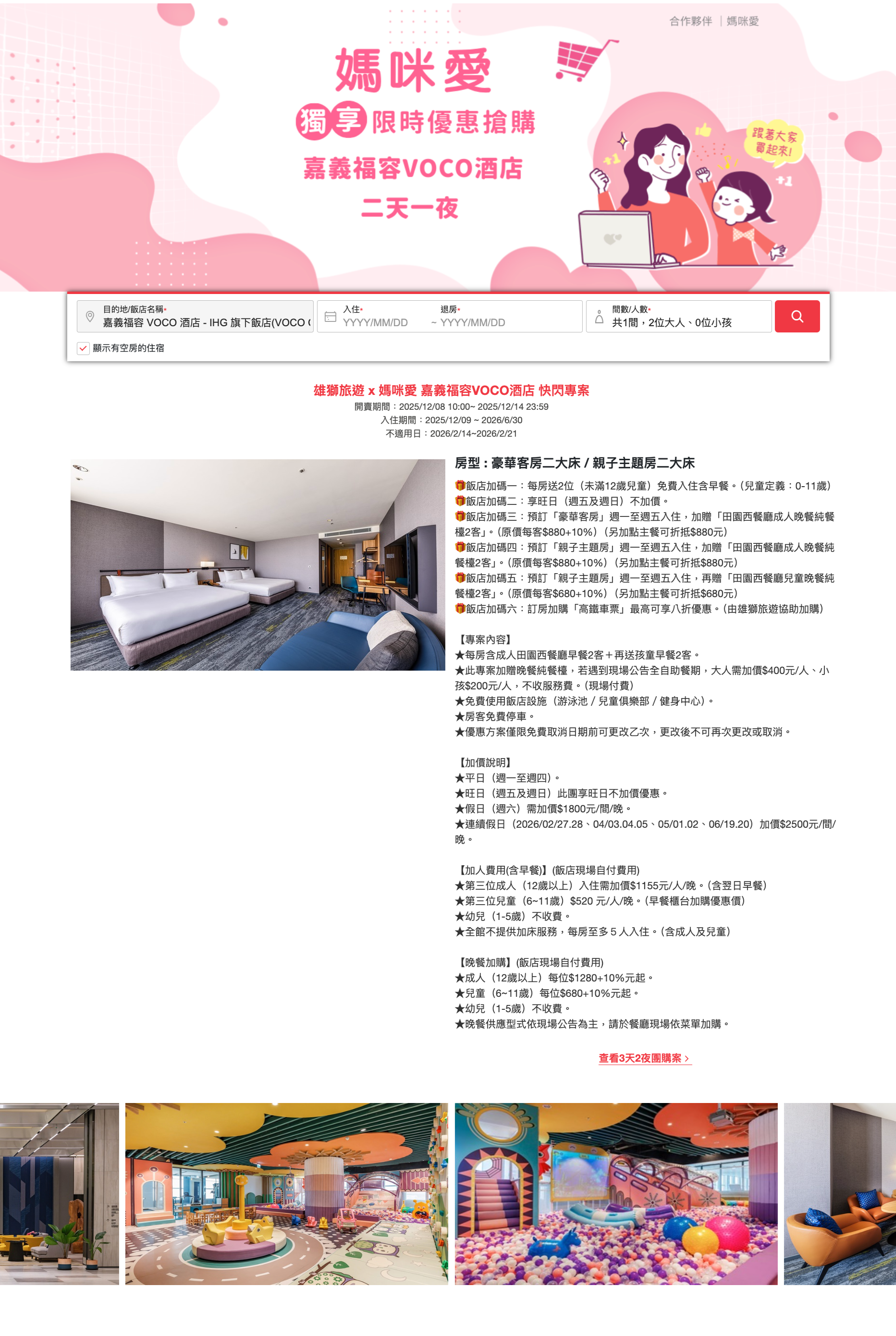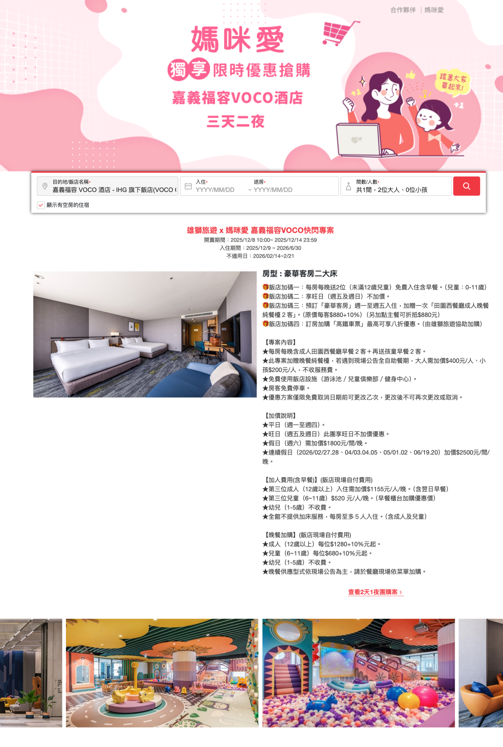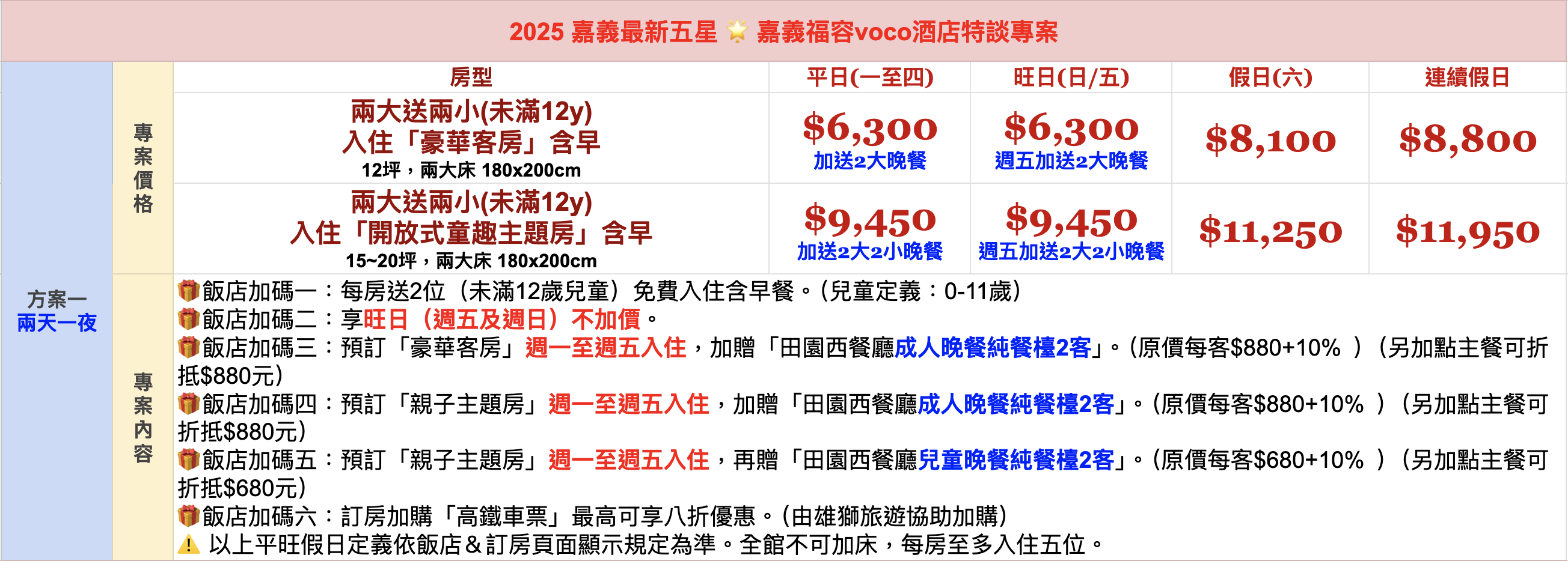 2. 查詢欲入住日期,請「依實際入住人數」搜尋,超過專案人數兩大兩小,多的人數(大人或小孩)如需加價入住,費用將於現場支付收取。