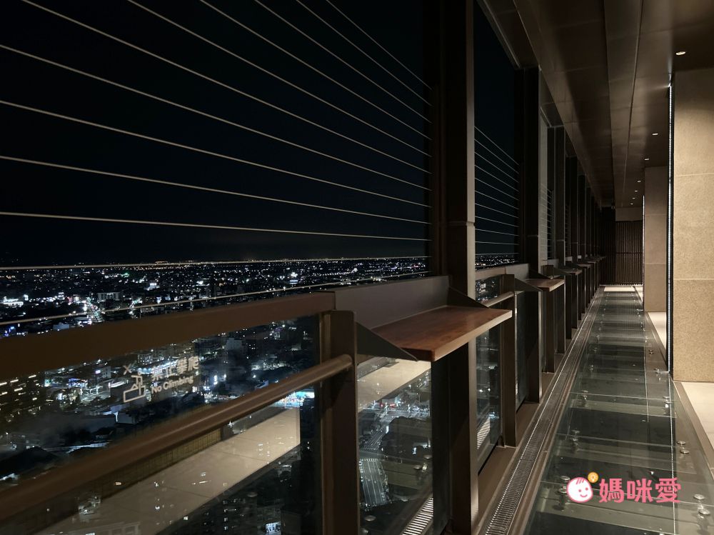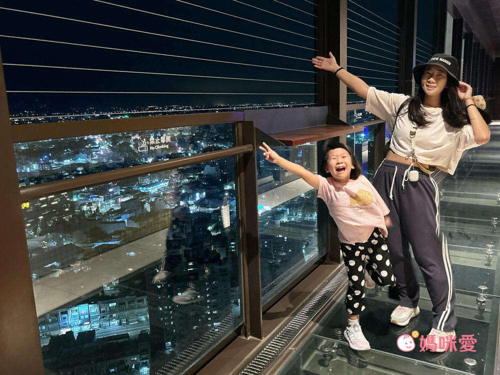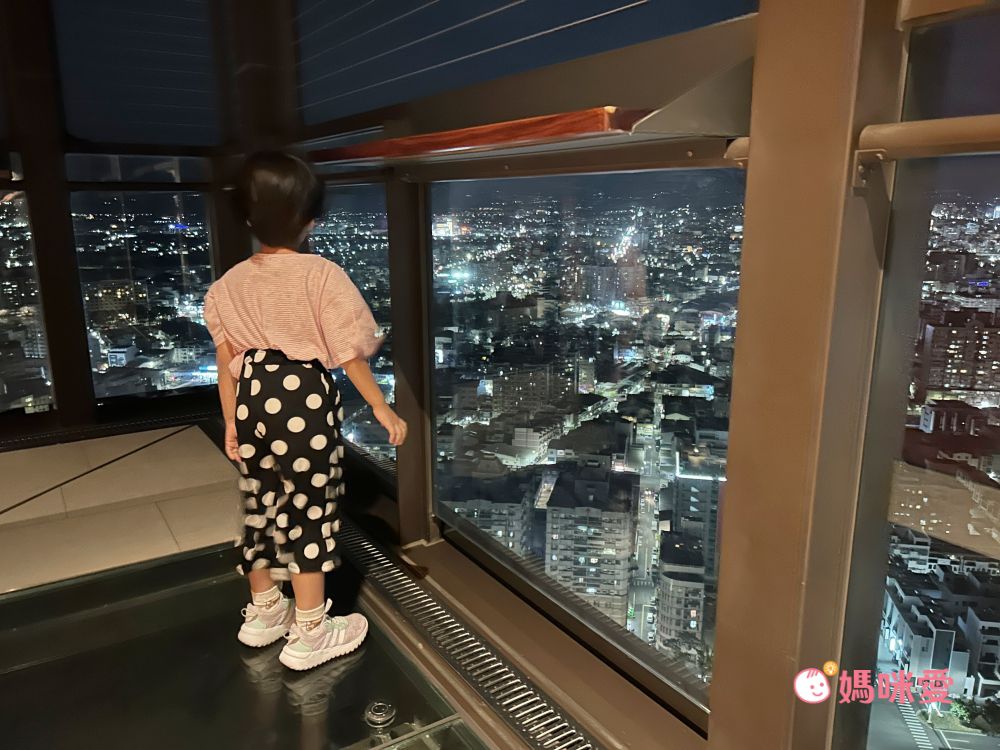 高樓層風真的很大,在夜晚非常涼快,踏出景觀台的時候我們又是一陣驚訝,這裡居然有平常要跑到觀光景點才有的透明步道~雖然底下只是一般的街景,但還是好驚人好特別,王美也很意外的不會害怕,在前面帶領我們漫步!