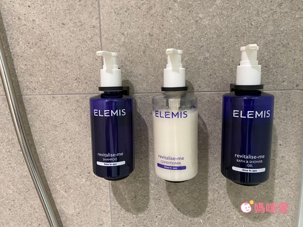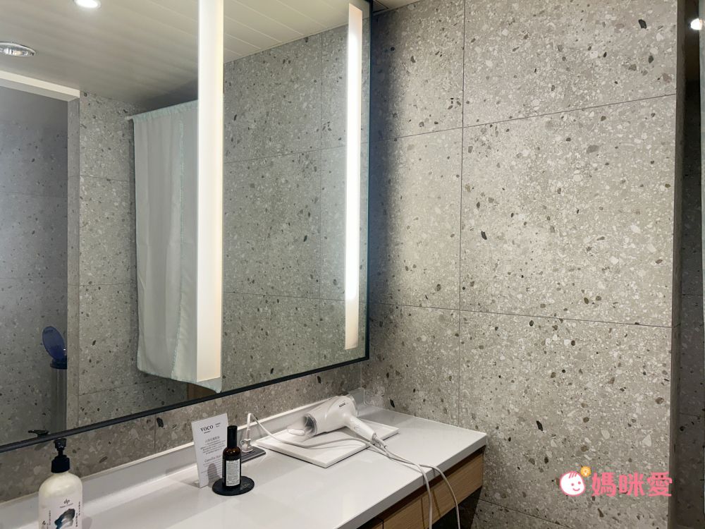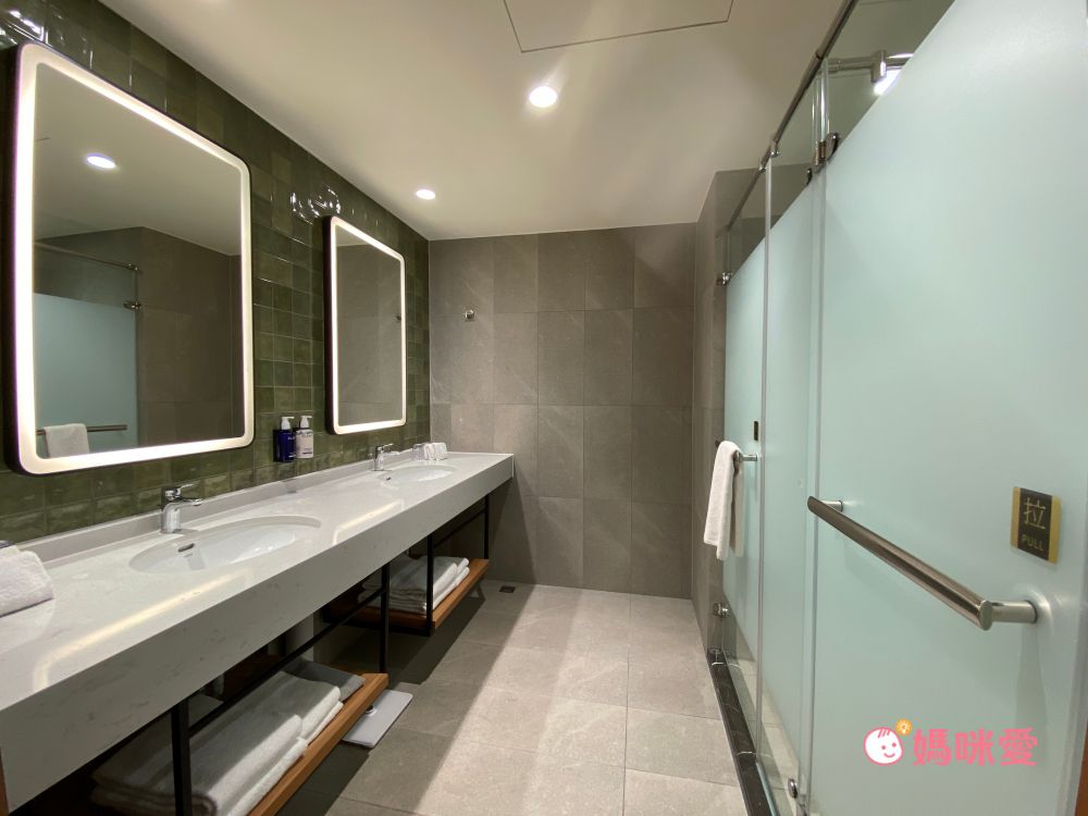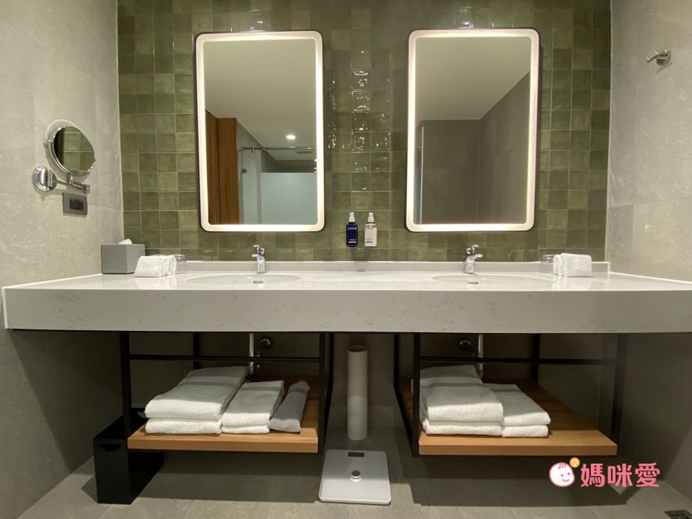 好喜歡雙洗臉台,像我們家四個人常常都要輪流刷牙洗臉,不想等太久的話這樣雙洗臉台真的很方便效率很多!洗臉台底下提供毛巾浴巾和吹風機、體重計,上方有毛巾和漱口杯、洗手乳和乳液,其他盥洗用品就需要自備囉!