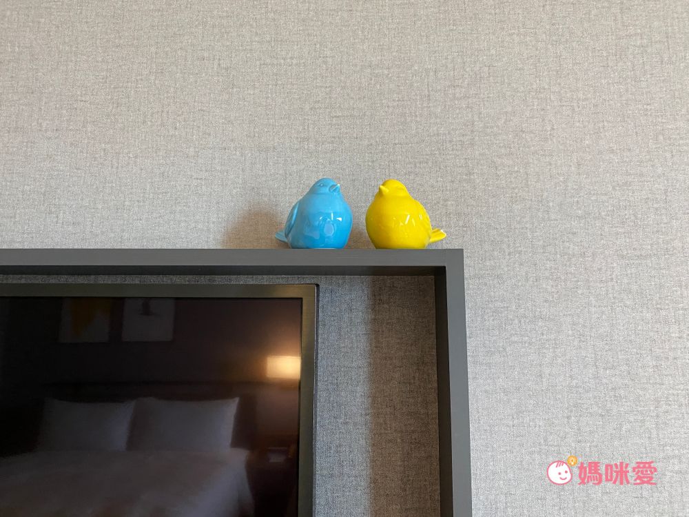 房間裡每個角落都能看到小鳥的身影,非常可愛的點綴裝飾,液晶電視和簡單分類的垃圾桶