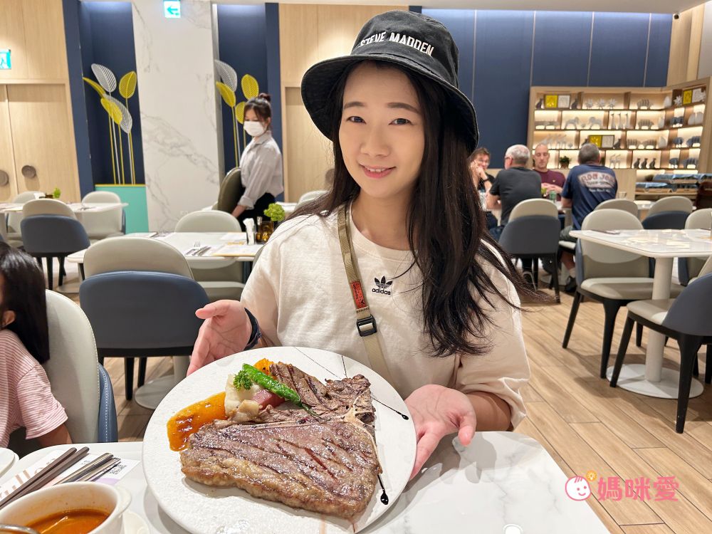 取餐取的差不多後,我們的主餐也送上桌了,兩人份的超大美國紅屋丁骨牛排,搭配醬汁真的軟嫩好吃!(⚠️ 依本專案供應為準,如為供應純餐檯,將不含主餐,有需要可現場加點)