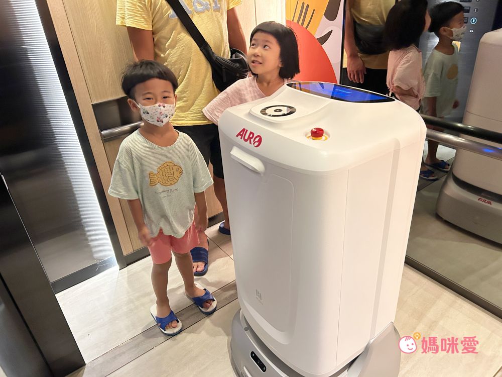 有次搭電梯還遇到了送餐機器人,孩子也覺得很特別,機器人還會自己按電梯呢~