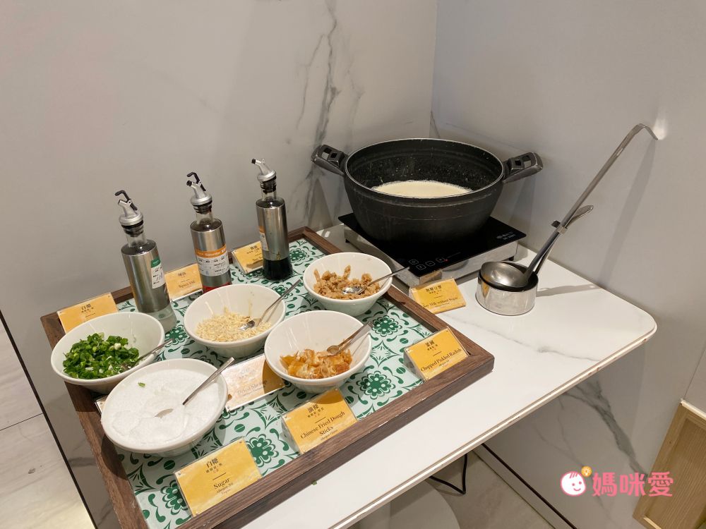 但這裡除了粥品和雞滷飯、涼麵之外,還有鹹豆漿也能DIY~提供的還有非常古早味的配料,都好經典耶!
