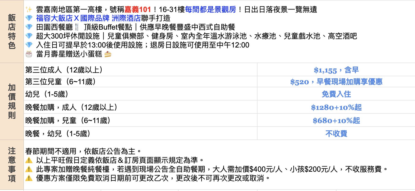 瘋狂敲碗!2024全新開幕「福容X洲際酒店」攜手打造的【嘉義福容voco酒店】終於來啦~入住嘉義101遠眺日出日落景觀,每間都是高樓層景觀房,享受五星級的服務、寬敞的客房與超豐盛的美食Buffet,免排隊就能吃到沙鍋魚頭/白醋美乃滋涼麵/雞肉飯等嘉義美食,免費使用300坪休閒設施:全年開放的室內溫水游泳池、水療池,還有超大空間的室內親子遊戲室、高空景觀台等,光是在飯店就夠讓孩子放電、爸媽放鬆啦~快來看看這次的優惠專案吧~
