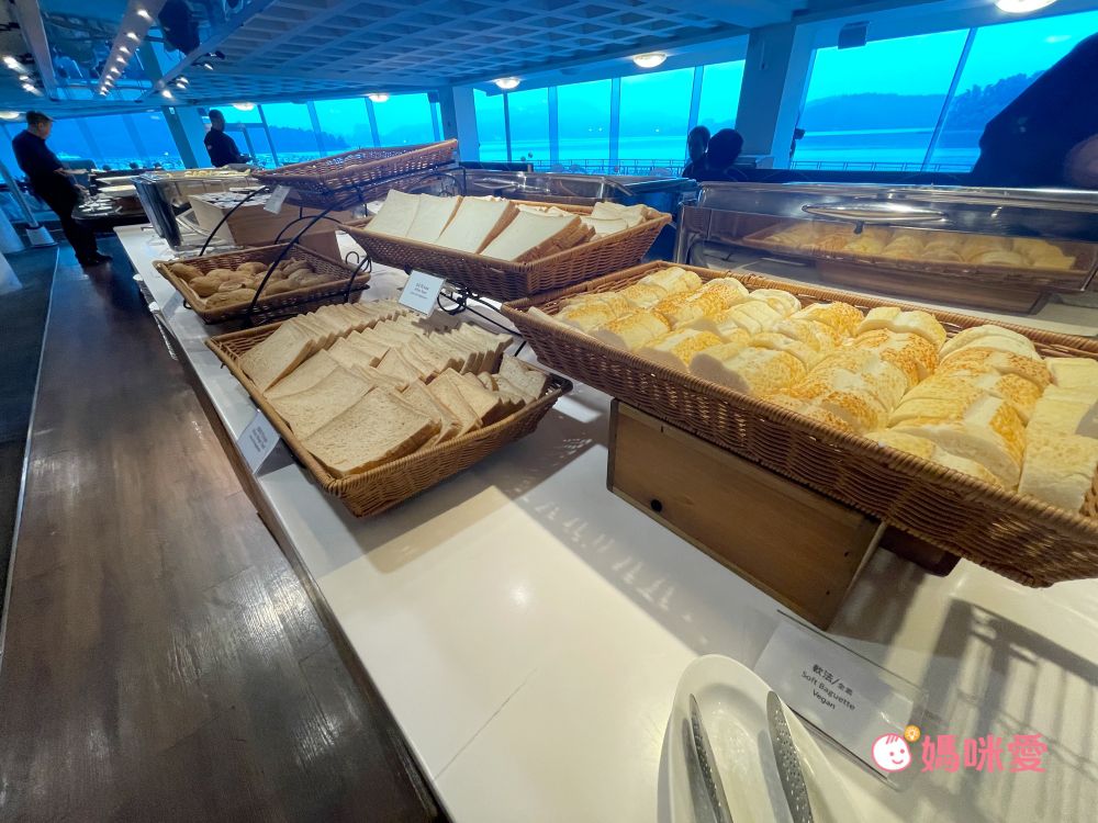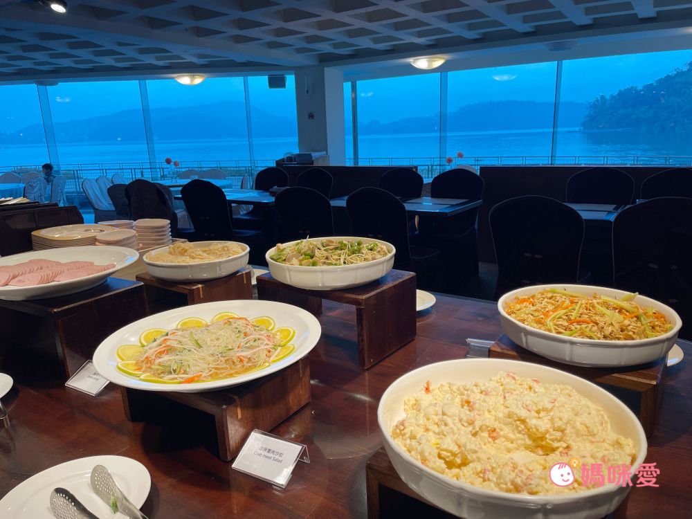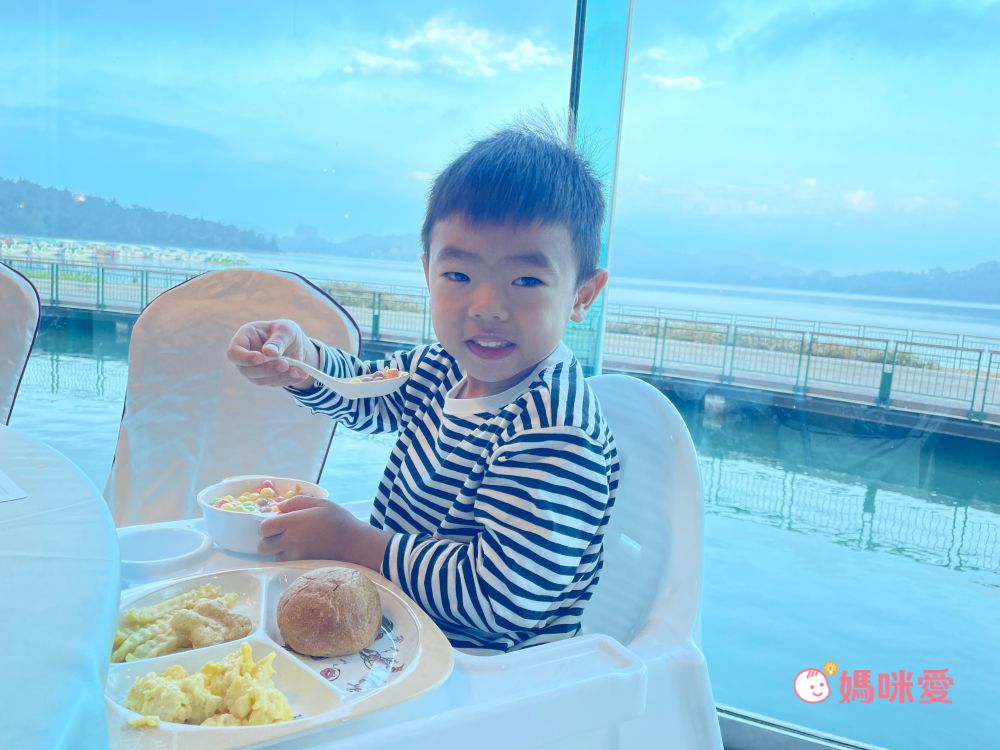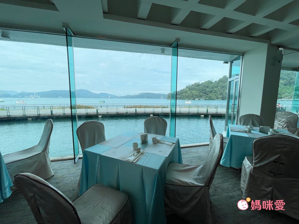 早餐步行到儷山會館的魚藻餐廳用餐,餐廳大面玻璃窗景,緊鄰日月潭邊用餐邊享用美食