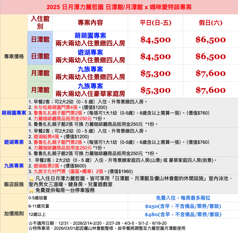 ☆特殊事項:2026/03/01起因儷山林會館整修,故早餐將調整至力麗哲園月潭館使用