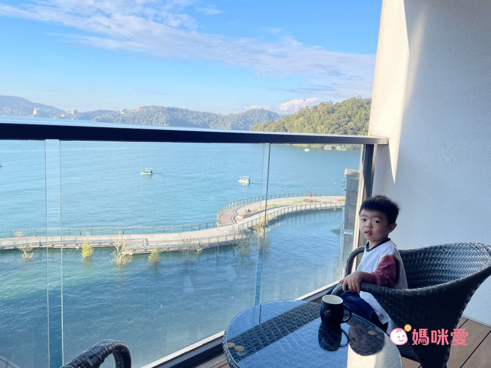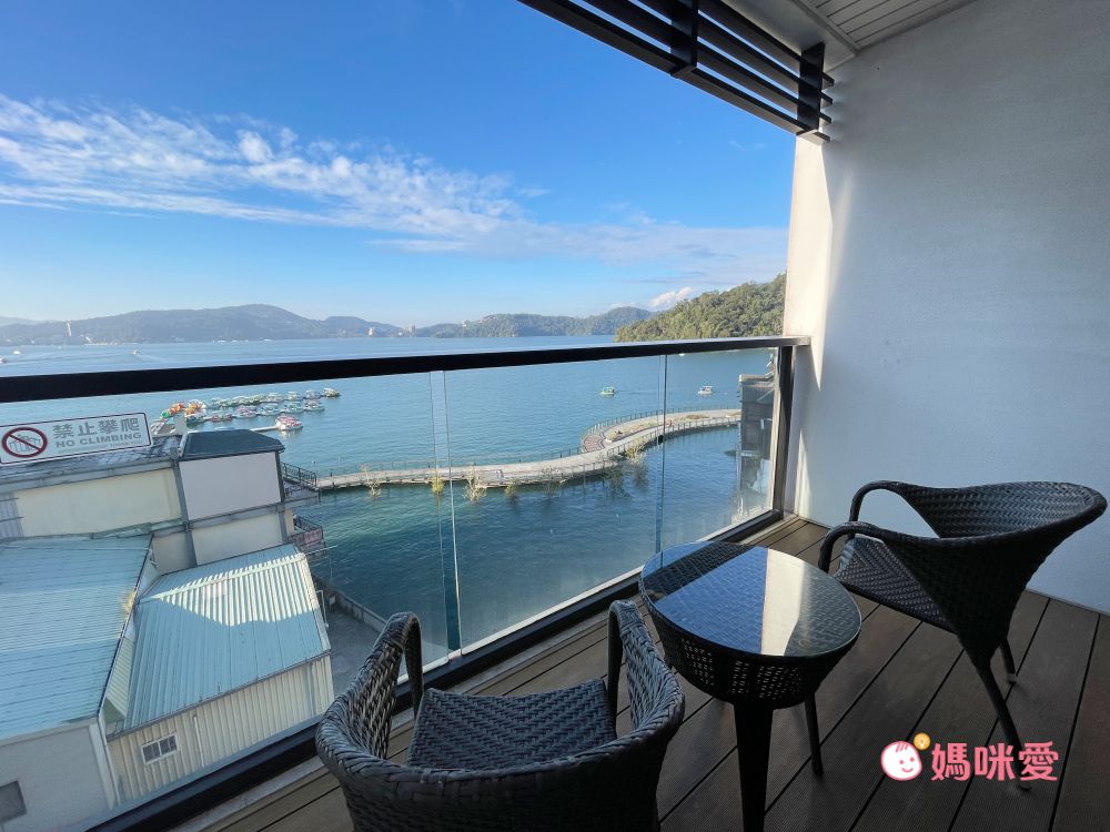 小樂媽媽最喜歡房間的陽台,映入眼簾整片湖景,坐在看這靜靜看著日月潭湖景也很療癒放鬆,情侶或朋友晚上小酌也很適合,陽台都有玻璃圍牆小孩坐在陽台上也不擔心太危險喔!!