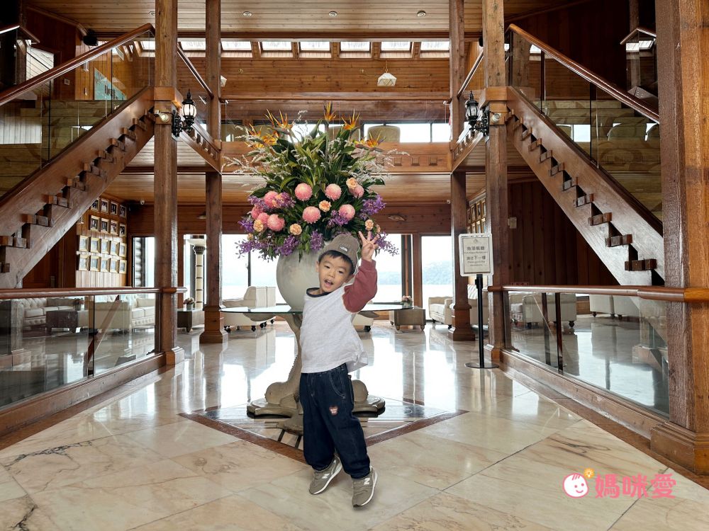 一進入儷山林會館內可以聞到非常舒服的原木香味,整片的湖景,搭配灑進的陽光,真的非常的療癒