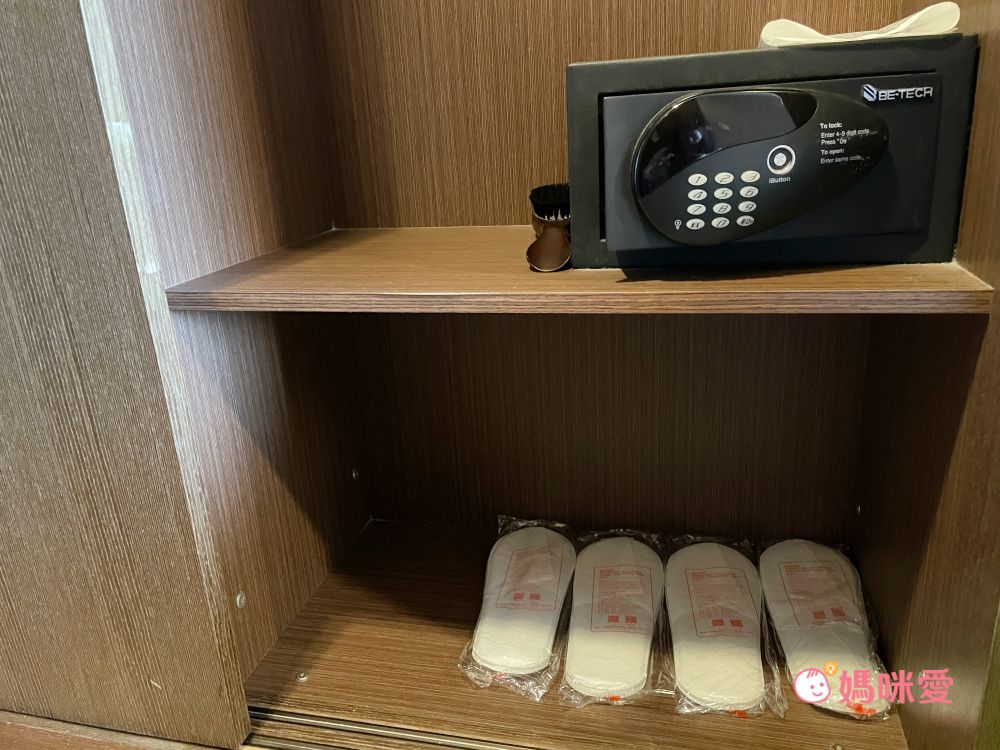 衣櫃還有提供飯店拖鞋和保險箱可以使用~