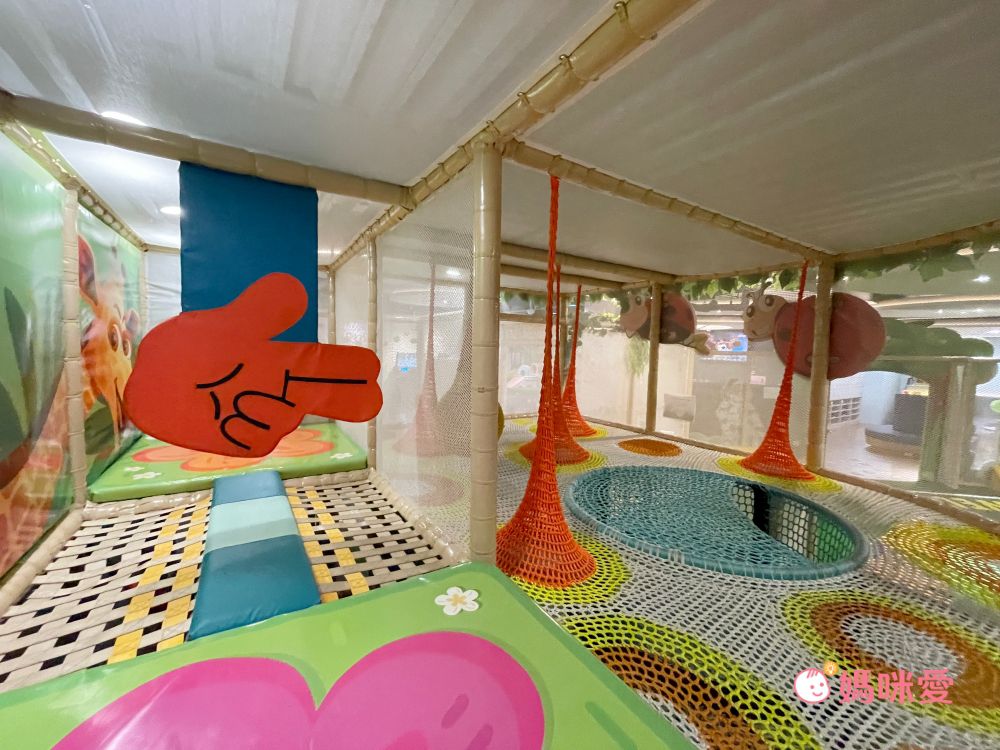 部落勇士區設計風格叢林感,綠色地板和各種動物風格的滑梯和遊樂設施,很像兒童版極限體能王