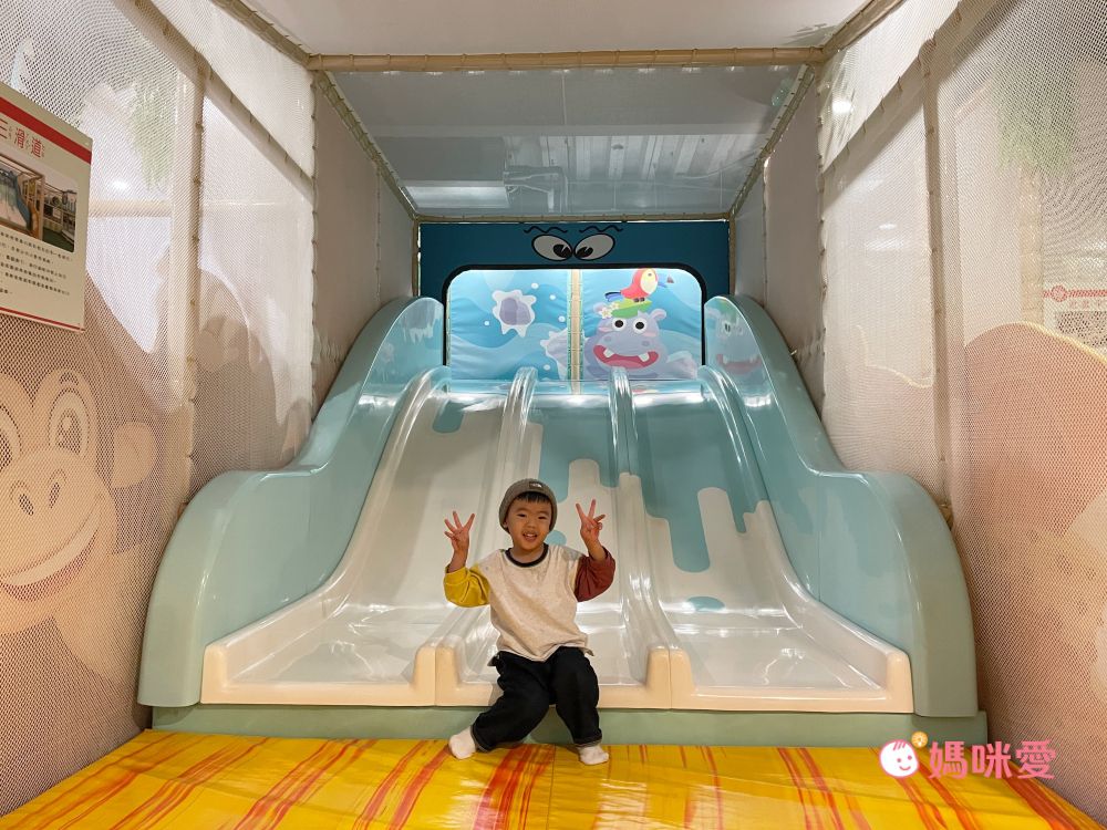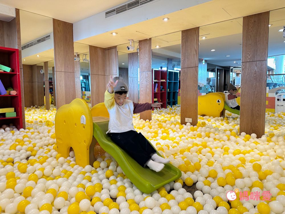 球池內有幼幼小孩可以玩的溜滑梯,小樂三歲大寶寶也玩得很開心!