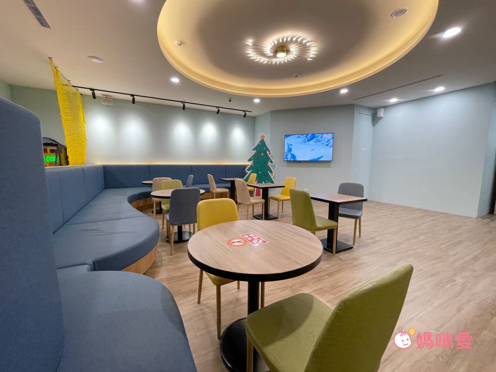 館內休息區座位也很多,座位很舒適有靠背的沙發椅,家長可以坐在休息區陪同,看得到孩子放心又舒適,牆上有播放卡通,小孩玩累也可以在這區稍作休息