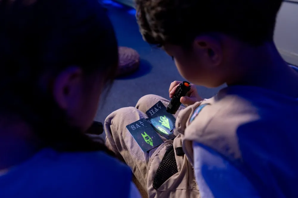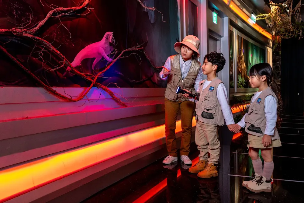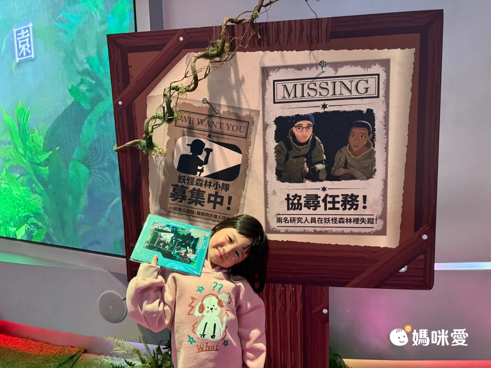 接著跟著工作人員進到一個小劇場,聽冒險家夫妻到底發生了什麼事、我們為什麼要來幫忙他們。這一段不只是坐著聽講或看影片,還會讓小朋友拿著手電筒在空間裡找線索,再搭配劇情一路往下一關前進,整個過程是慢慢鋪陳的。