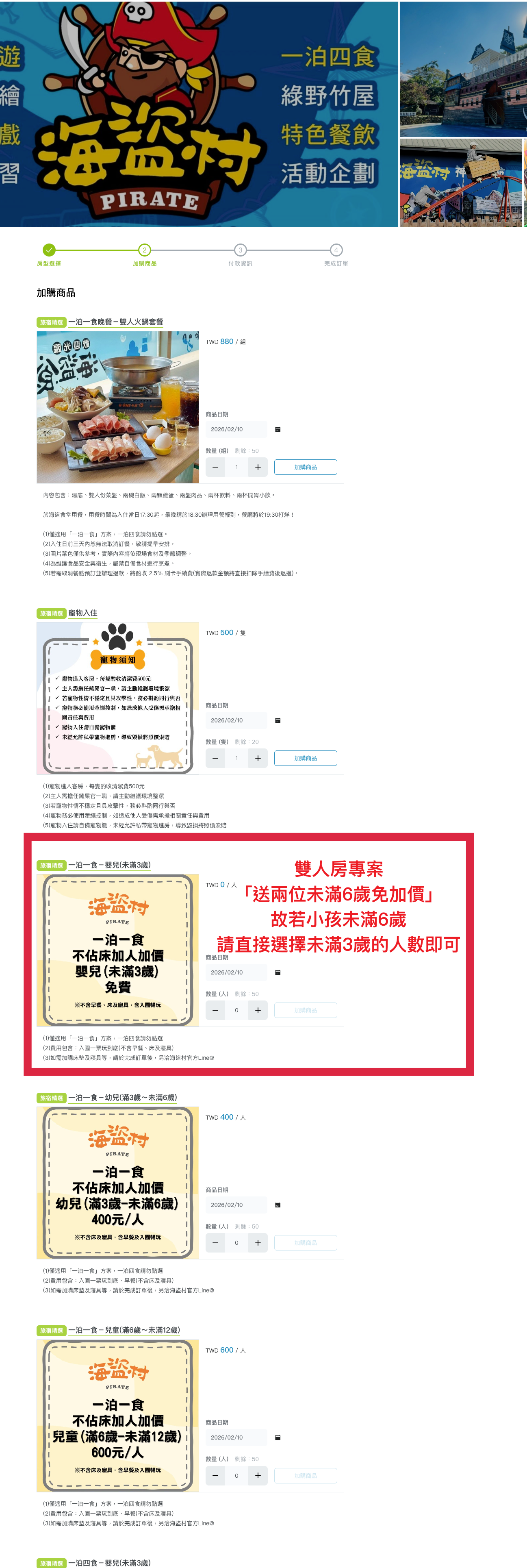 2. 選擇日期與房型後,加購頁面可選擇是否加購「晚餐火鍋、寵物同住、兒童加人加價」