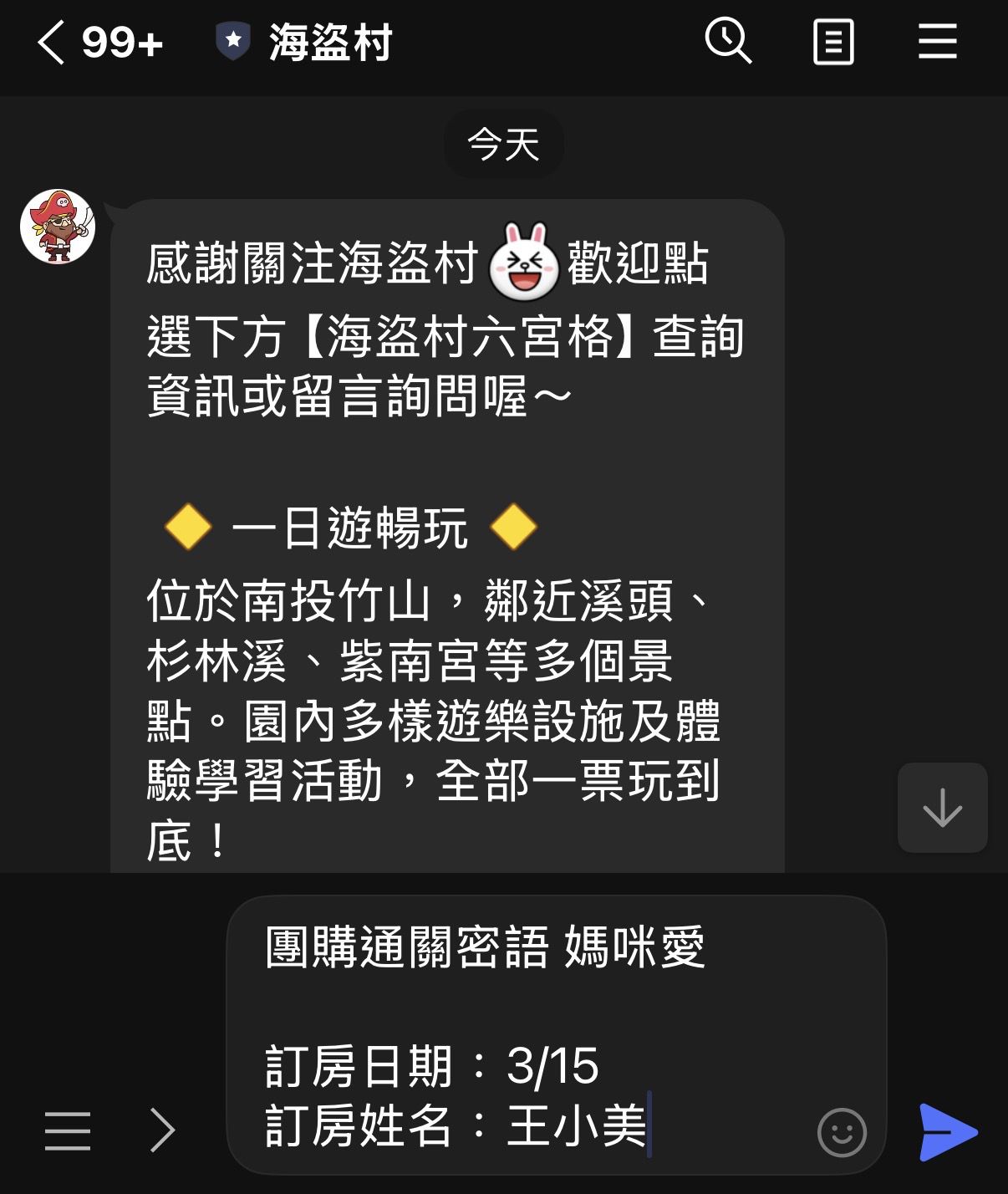 4. 完成付款後,請截圖訂單頁面,並主動聯繫海盜村Line客服(id:@pirate.tw),附上「入住日期、預約大名」與通關密語「媽咪愛」,將由工作人員為您備註加碼贈送下午茶~