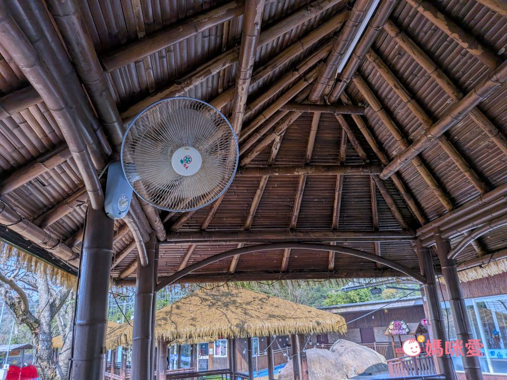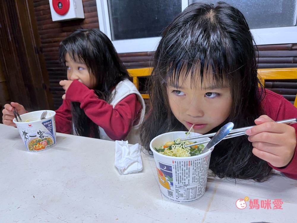 兩間竹屋之間是共用的客廳,有桌椅,晚上在這邊聊天休息很涼爽愜意,叮噹洗完澡後有要求說想要吃泡麵(對他們來說這樣有渡假感),就是坐在這邊開開心心的完食