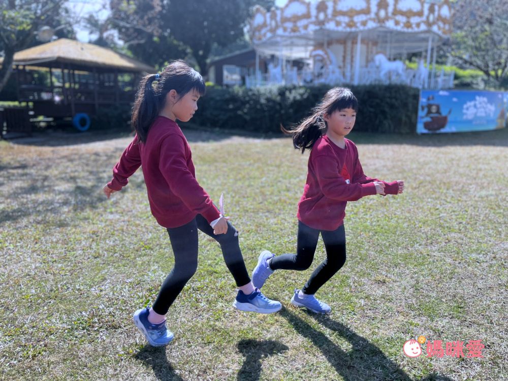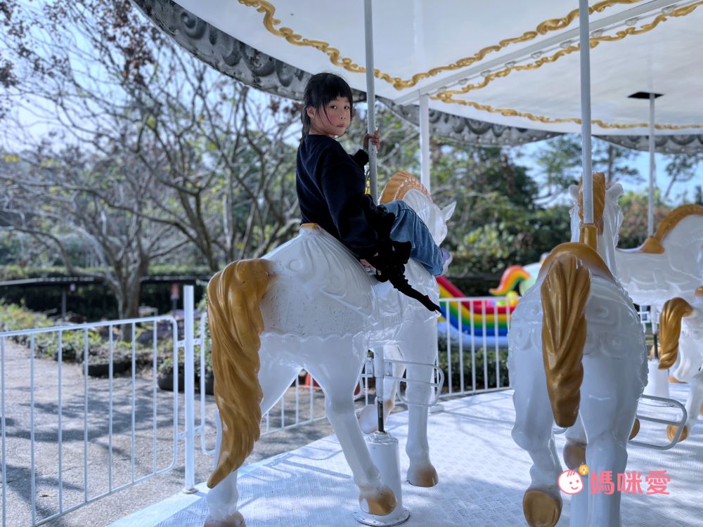 草地上有一座「旋轉木馬」,也是小孩喜愛的基本款!