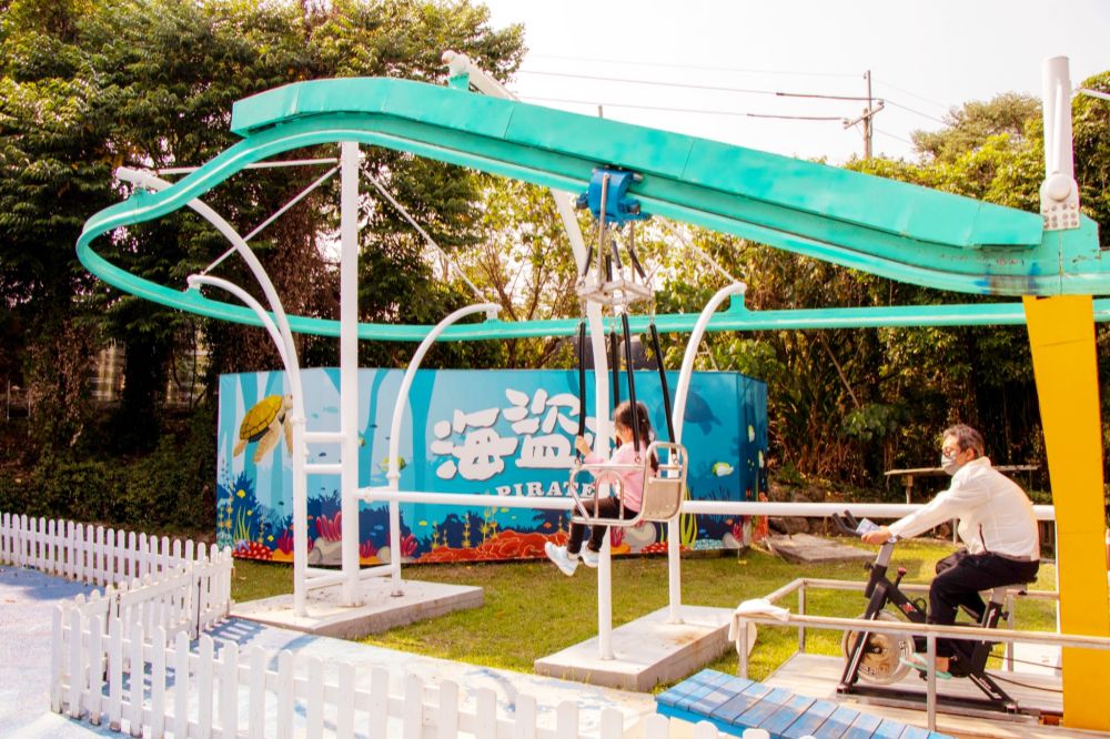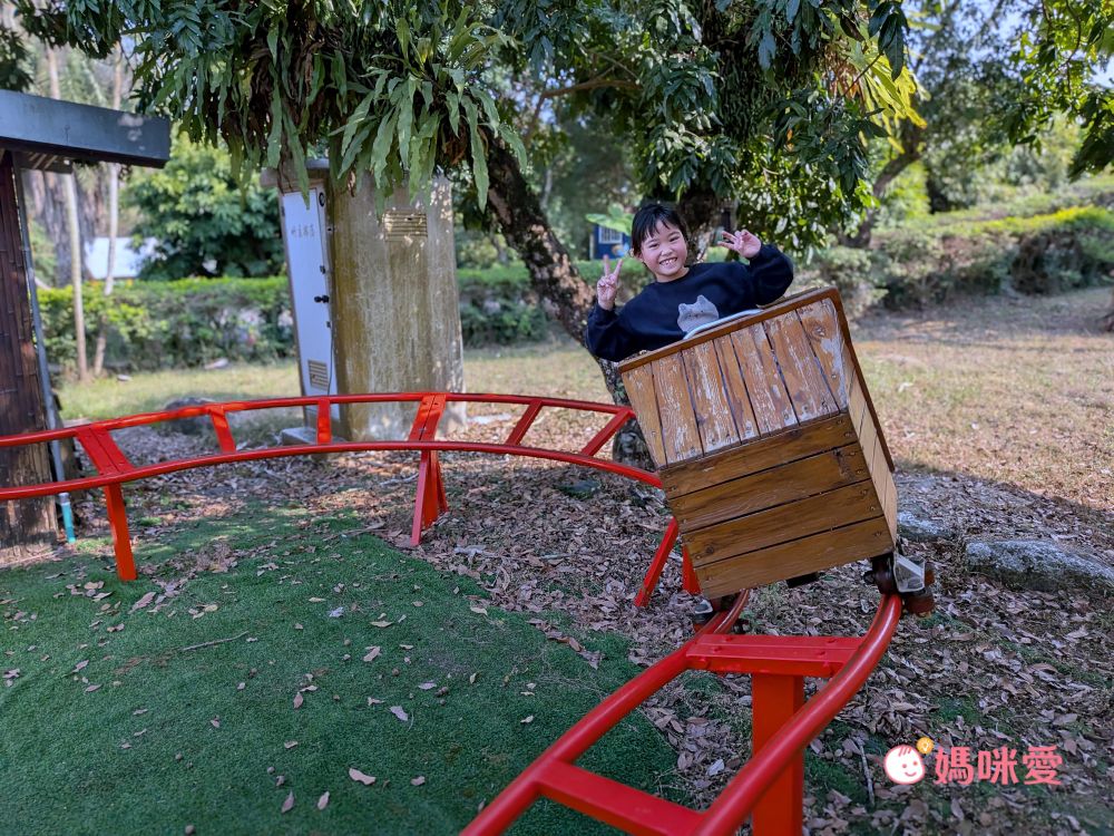 園區所有設施都是很親子友善的,是一個設計給孩童的樂園。最靠近大門口,也最吸引叮噹注意的設施,就是海盜船!這是小小孩也可以玩的「迷你海盜船」,而且工作人員還會詢問會不會太高之類,可以客製化調整,服務超好