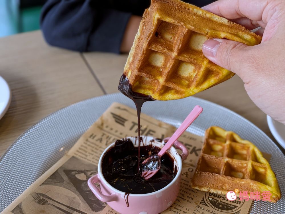 蜂蜜紅茶香氣優雅,巧克力鬆餅則是簡單粗暴,巧克力醬多、多、多,小孩愛死