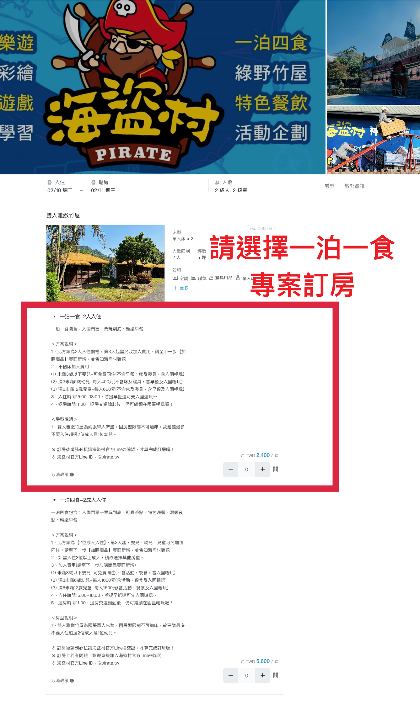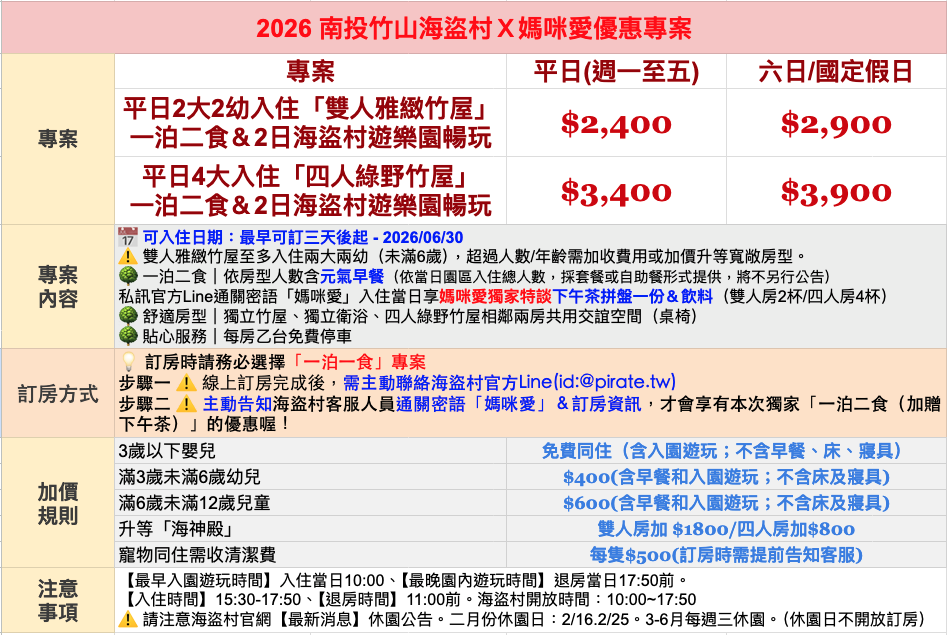 ⚠️ 訂房後請主動聯繫園區官方LINE@:@pirate.tw(點我加入),並告知通關密語「媽咪愛」領取專案優惠、才算完成訂房喔 ‼️
