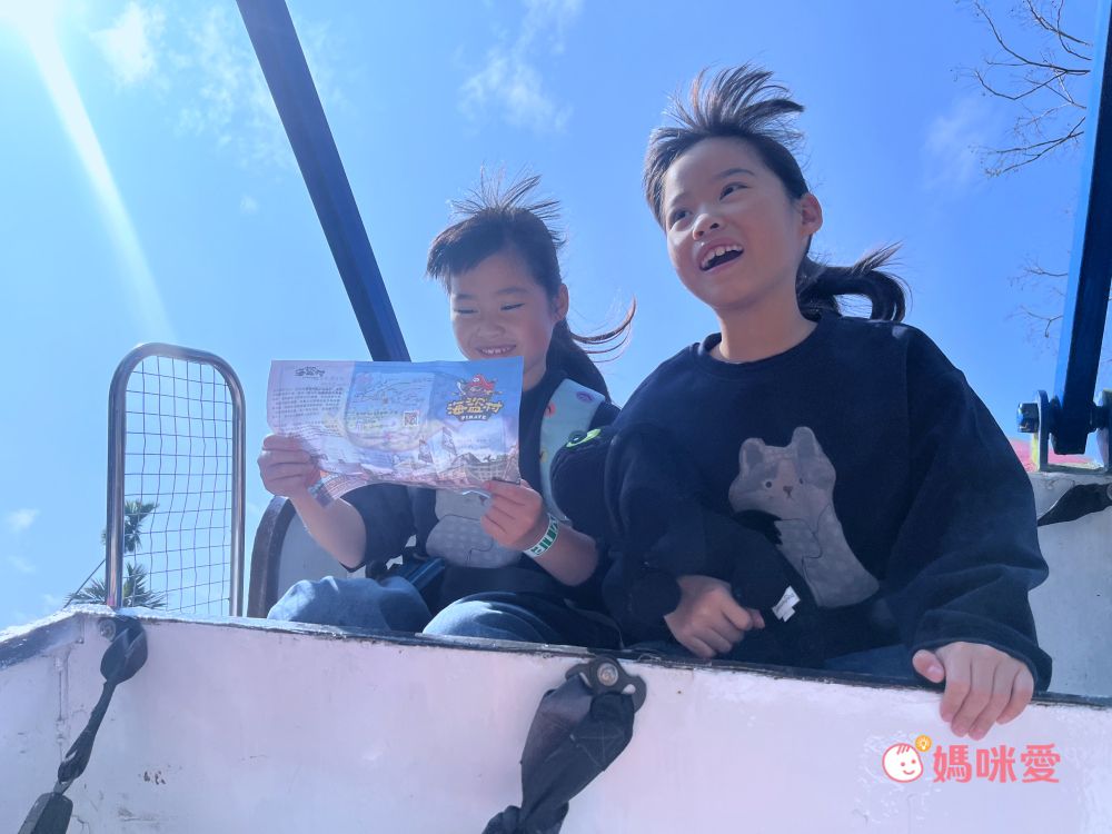 就是有點太輕鬆了,我們家叮噹兩姐妹在遊樂園最愛的就是海盜船,膽子超大、常常搭到爸比求著說不要了好嗎…海盜村的小海盜船,對他們來說像在玩蹺蹺板,看他們一邊搭一邊研究地圖,是不是對海盜船很不尊重?(不過相對來說就真的很閤家同樂,小小孩也OK喔!)