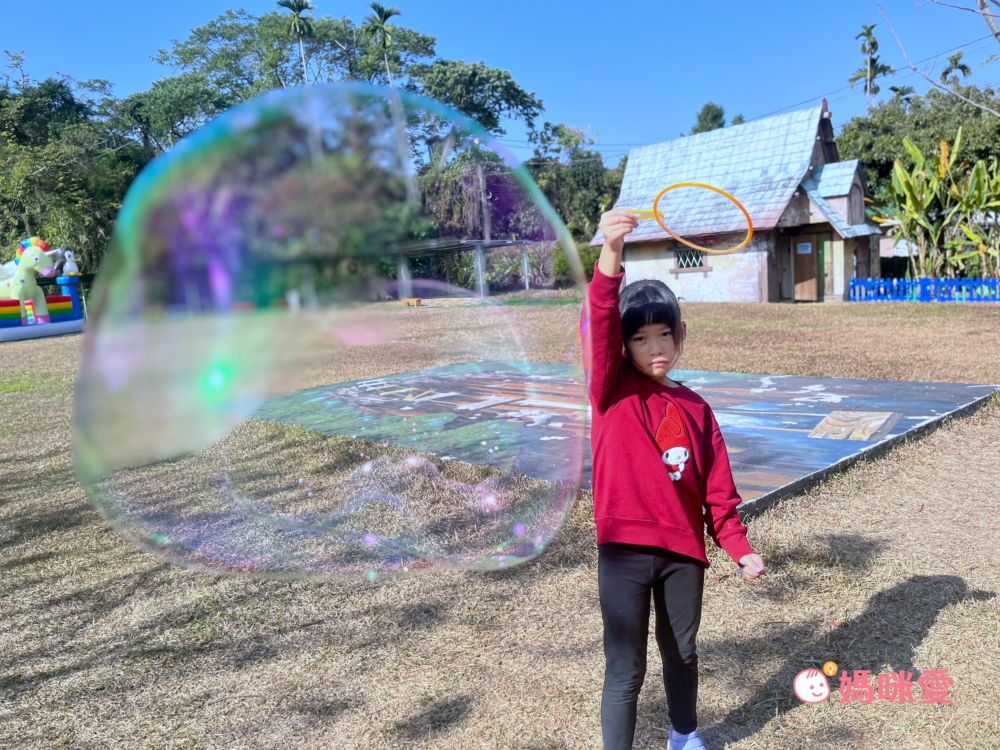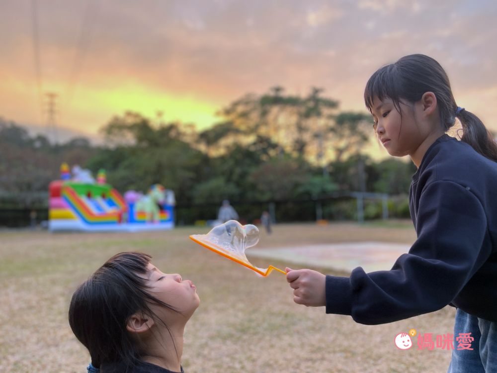 其實對叮噹來說,光是草地就超好玩啦~園區還有貼心準備了泡泡玩具和球,讓孩子可以大放電!(敬請各位家長幫忙留意免費設備使用的禮儀,分享的快樂勝過獨自擁有喔~)