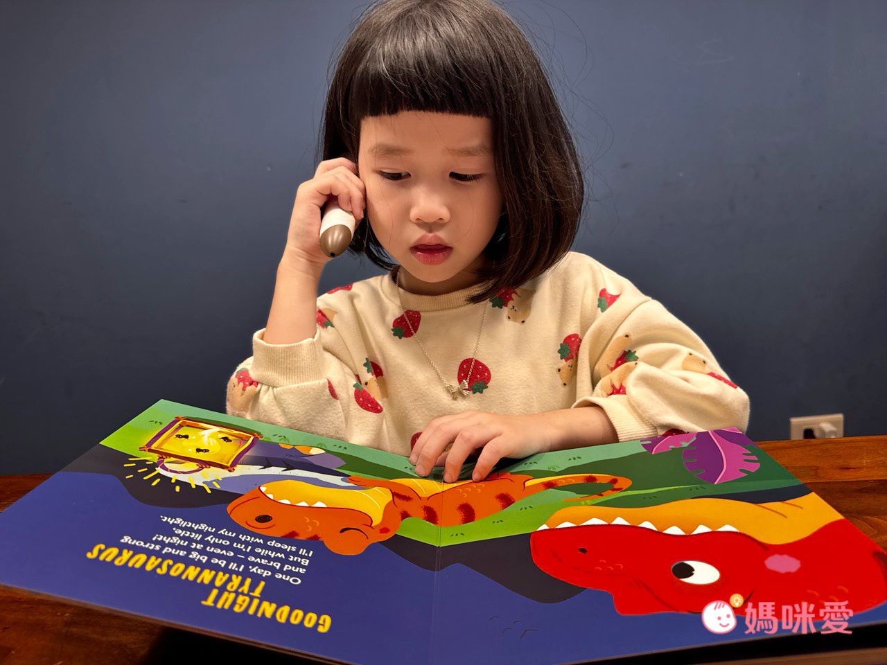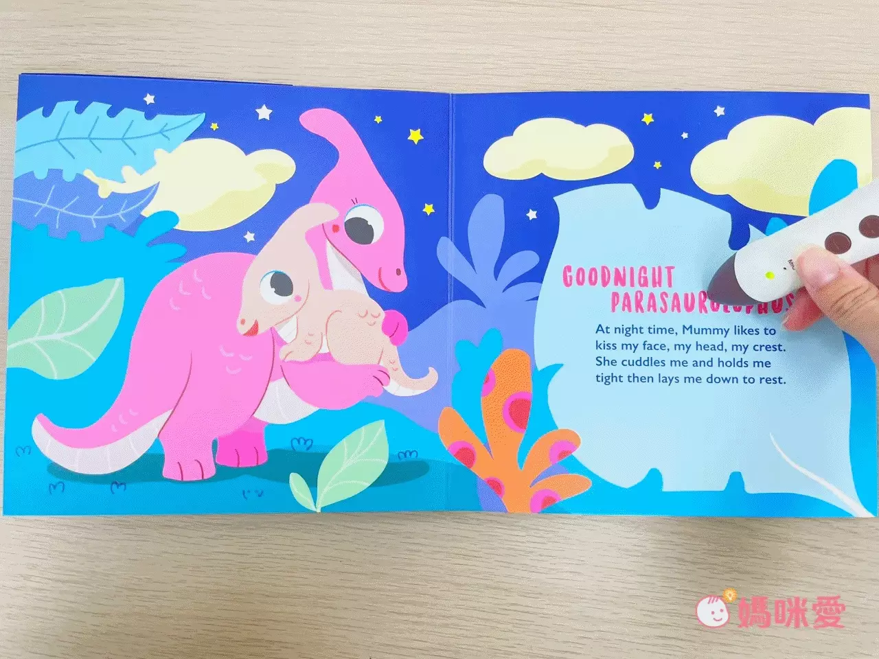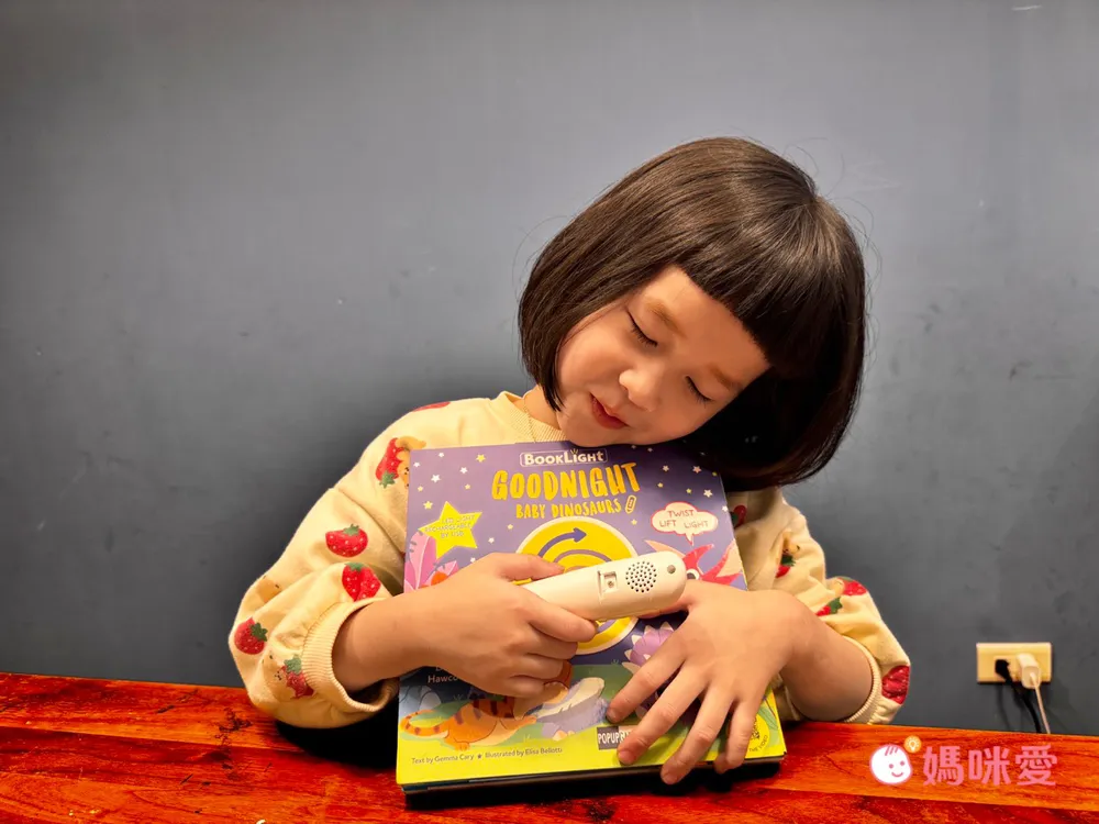 這陣子入睡前,芙咪都會打開夜燈,拿起點讀筆開啟恐龍的溫柔對話、驚喜音效⋯聽著聽著、看著看著,整個節奏就這樣慢下來💤