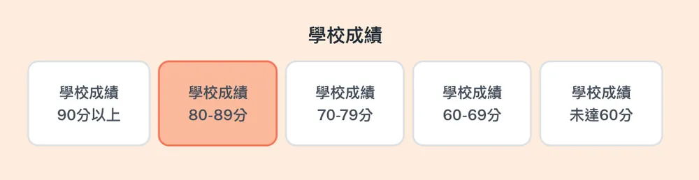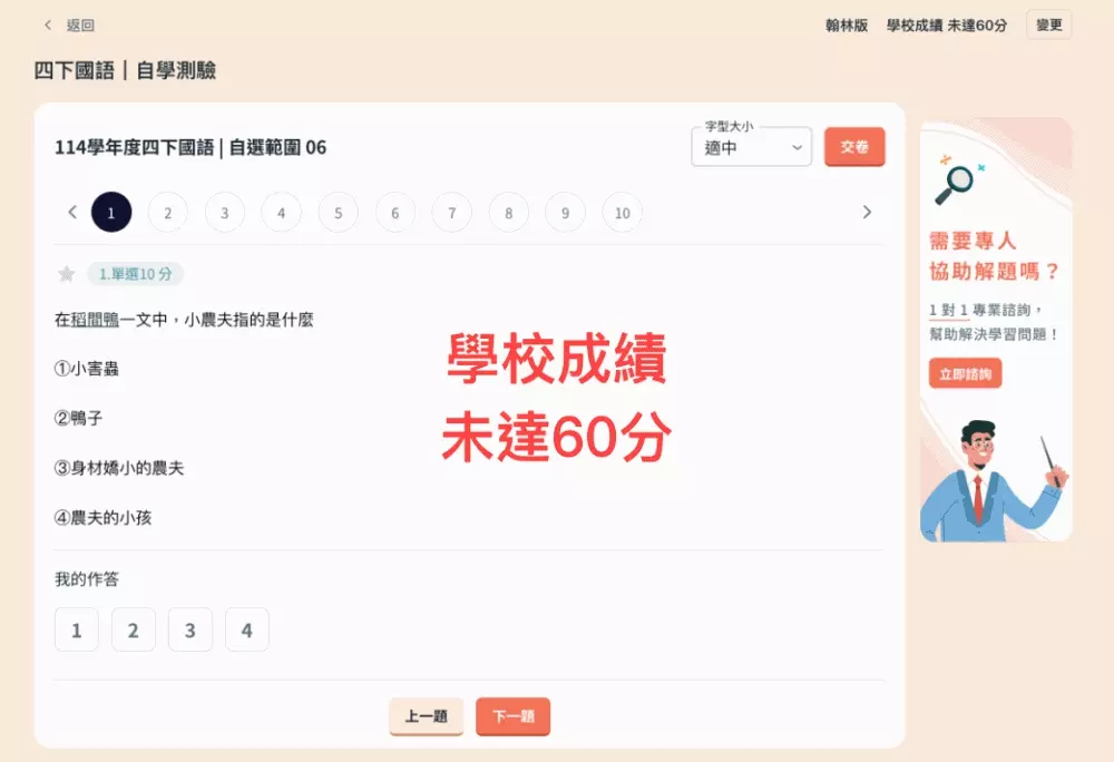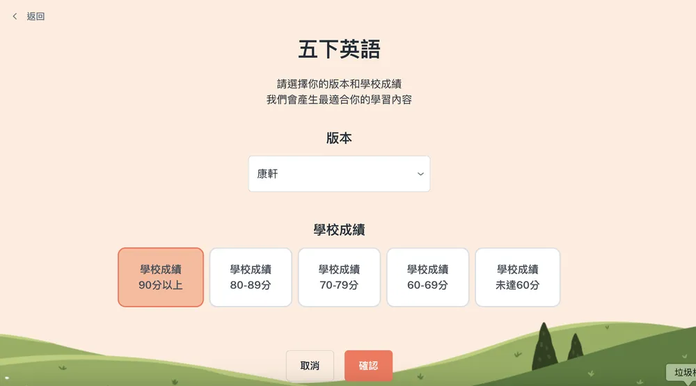媽媽覺得是一套非常完整也很細緻的線上課程,除了有真人影片可學習(一年級的是可愛動畫,很適合吸引低年級寶貝的注意力),考題難易也很有鑑別度,在一開始要作答的時候,就會先問你平時的成績大概落在幾分區間(下圖),不然出了太難的題目會讓孩子沒自信啊~~