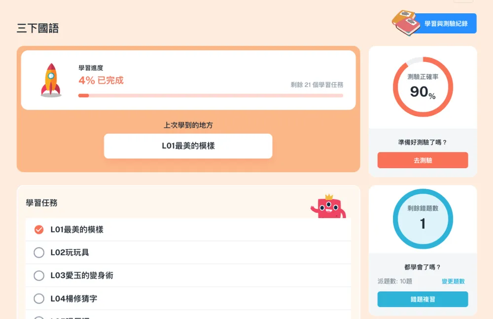 作答前會先確認孩子平時成績,系統自動媒合難易度。不讓挫折感擊垮孩子,讓他們像玩遊戲闖關一樣,享受拿到 100 分的成就感。