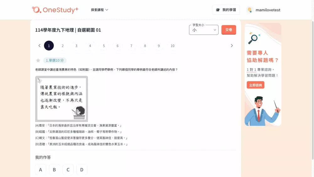 還想講一個我覺得系統貼心的地方,是可以選字體大小,雖然選擇了使用線上教學工具,還是會擔心孩子的視力受到任何外力影響,所以我還滿推薦這個小細節的
