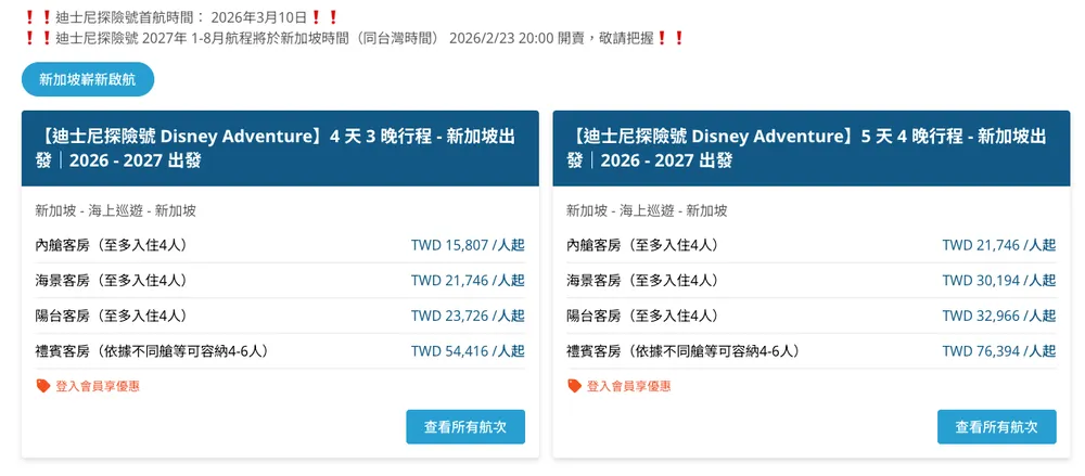 【迪士尼探險號 Disney Adventure】自 2026/3/10 首航起,固定每週一、四出發,分別可選4天3夜、5天4夜的行程~每人只要台幣$17XXX起,就能體驗有如24小時都在迪士尼樂園的快樂~從睜眼到入眠都被滿滿的多巴胺環繞~‼️ 編媽個人建議直上五天四夜~‼️畢竟都已經特別飛一趟去新加坡了~一定要把快樂值拉到最高!🤩
