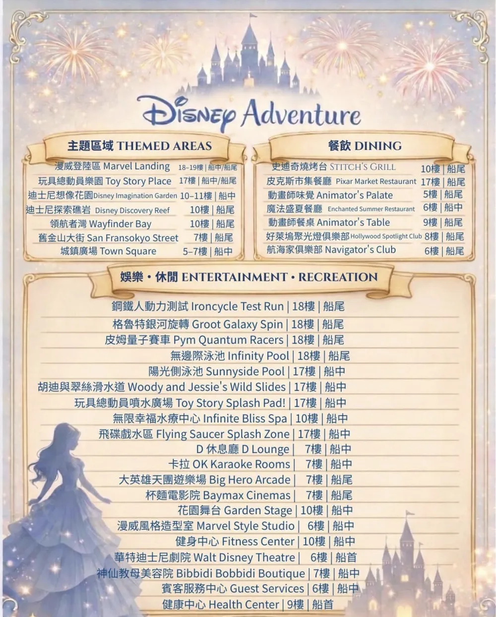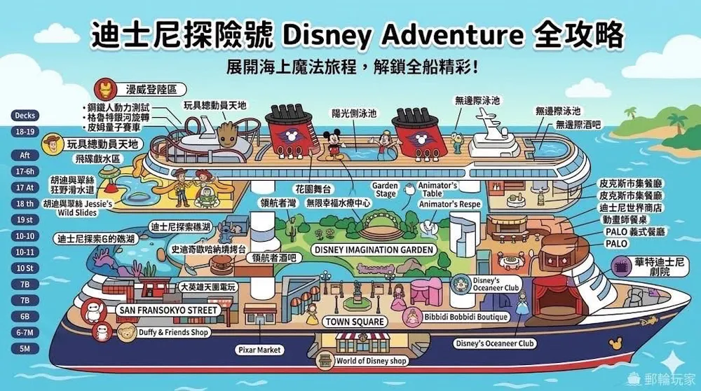 像是【迪士尼探險號 Disney Adventure】這種大型郵輪真的彷彿一座海上小城市,建議大家可以提前稍微看一下樓層、設施分佈圖,上船後也可以透過一些小撇步、或是打開專屬app,就能輕鬆找到方向囉!