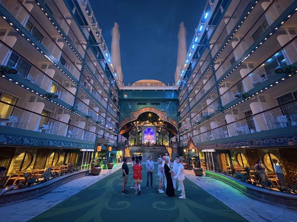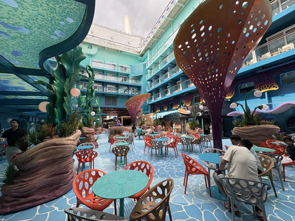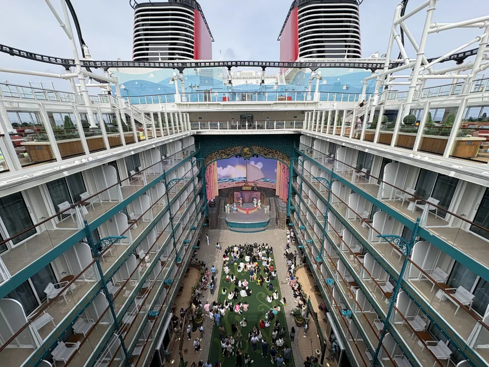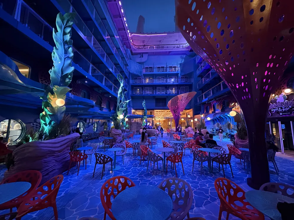 【迪士尼探險號 Disney Adventure】的中庭景色有分花園跟礁景,白天跟夜晚都非常有特色呢!旅客可以在這邊休息、或是看表演喔!