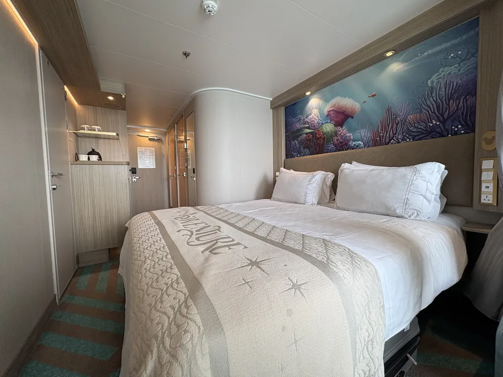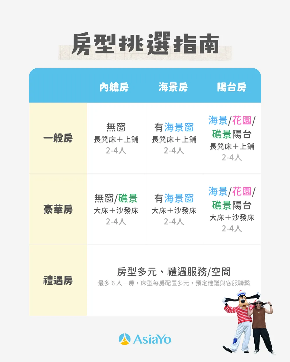 基本上郵輪的房型最主要分為四大艙房,由最平價到最高等級分別為「內艙」、「海景」、「陽台」、「禮賓」四種,可入住人數由2-6人不等。其中【迪士尼探險號 Disney Adventure】更為特別之處是,每種不同艙等,還會有分不同的「佈置」如「一般/豪華」,或分不同的「景色」如「海景陽台/發現礁陽台/花園景陽台」等。