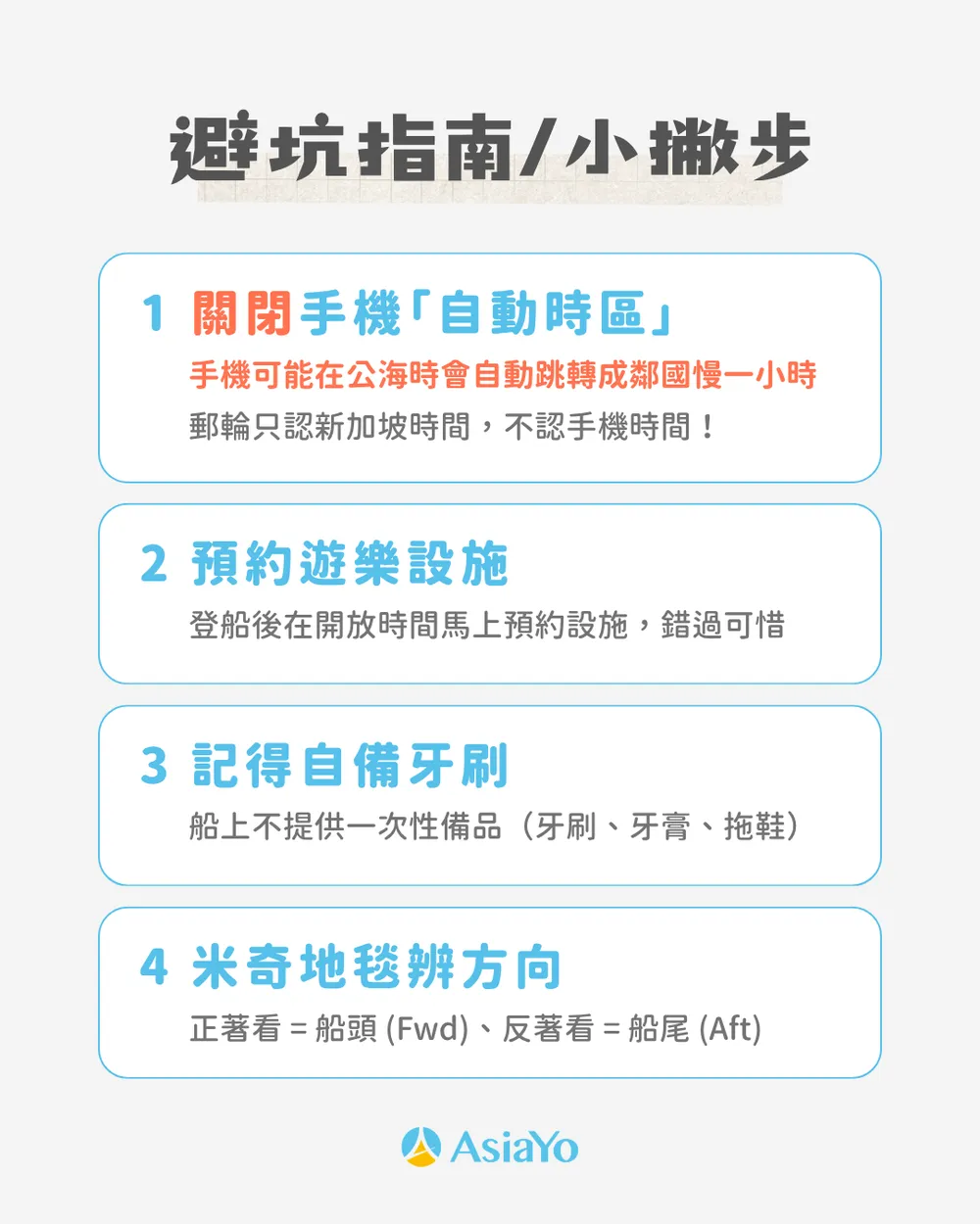 船上不提供一次性牙刷、牙膏與拖鞋,記得自己帶