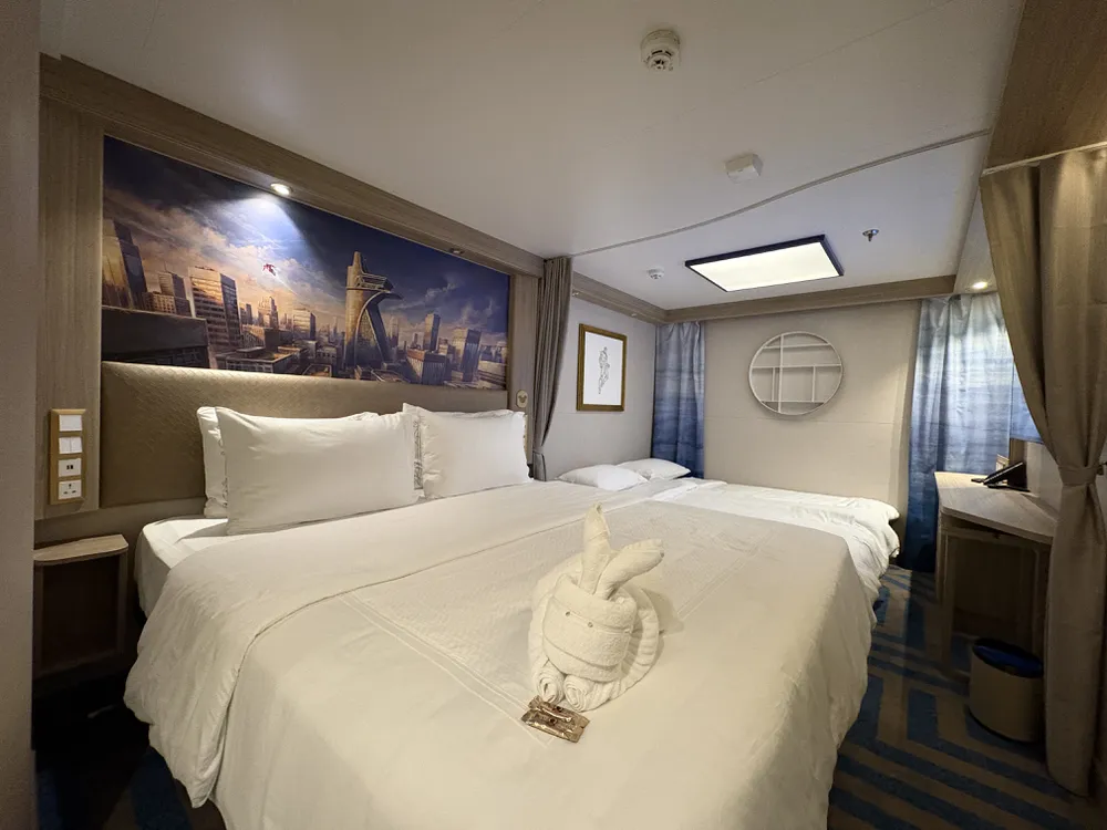 豪華內艙客房如果選擇3人以上的話,會將沙發床鋪開成第二張雙人床喔~像是下圖這樣