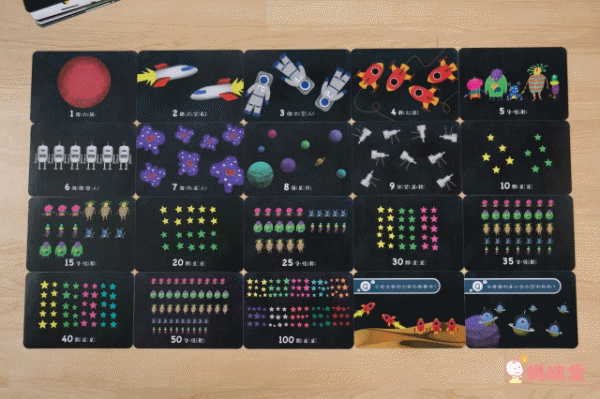 圖卡翻到背面是我們少見的太空主題,以太空為情境,建構幼兒對數量的概念!例如:1 是一個太陽、2 是兩艘太空船、3 是三個太空人....引導孩子數數!