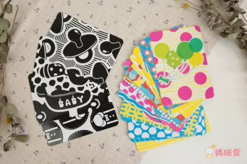 參雜了幾張彩色的圖卡在 3 個月之後加入使用,不管是黑白或是彩色,圖案都非常精緻好看喲,並且以大豆環保油墨印刷,媽咪可以安心使用~